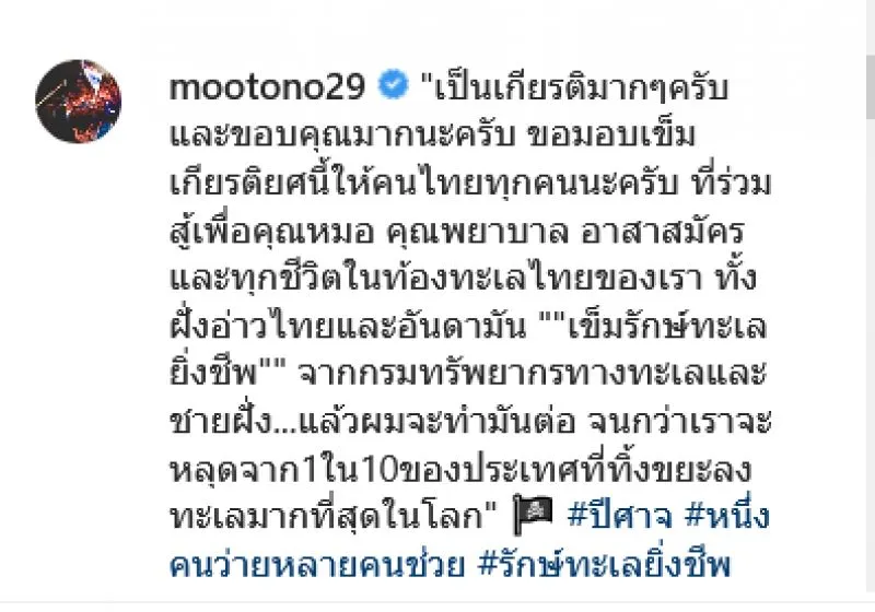 โดยล่าสุดเมื่อวันที่ 8 มี.ค.64 เจ้าตัวได้โพสต์ภาพเข็มกลัด และเกียรติบัตร ที่ได้รับ ลงในไอจีส่วนตัว พร้อมบรรยายความภาคภูมิใจนี้ว่า เป็นเกียรติมากๆครับ และขอบคุณมากนะครับ ขอมอบเข็มเกียรติยศนี้ให้คนไทยทุกคนนะครับ ที่ร่วมสู้เพื่อคุณหมอ คุณพยาบาล อาสาสมัครและทุกชีวิตในท้องทะเลไทยของเรา ทั้งฝั่งอ่าวไทยและอันดามัน เข็มรักษ์ทะเลยิ่งชีพ จากกรมทรัพยากรทางทะเลและชายฝั่ง…แล้วผมจะทำมันต่อ จนกว่าเราจะหลุดจาก1ใน10ของประเทศที่ทิ้งขยะลงทะเลมากที่สุดในโลก
