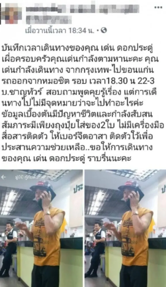 เรียกได้ว่าจากกรณีที่เฟซบุ๊กรายหนึ่ง ได้ออกมาโพสต์ข้อความ เกี่ยกับการเดินทางมาคนเดียวของตลกชื่อดังอย่าง น้าเด่น ดอกประดู่ เผื่อญาติๆหรือทางครอบครัวกำลังติดตามตัว ซึ่งการเดินทางในครั้งนี้ดูจะไม่มีจุดหมายว่าจะไปทำอะไร แต่จากข้อมูลเบื้องต้นเหมือนจะมีปัญหาชีวิตและสับสนอะไรบางอย่าง