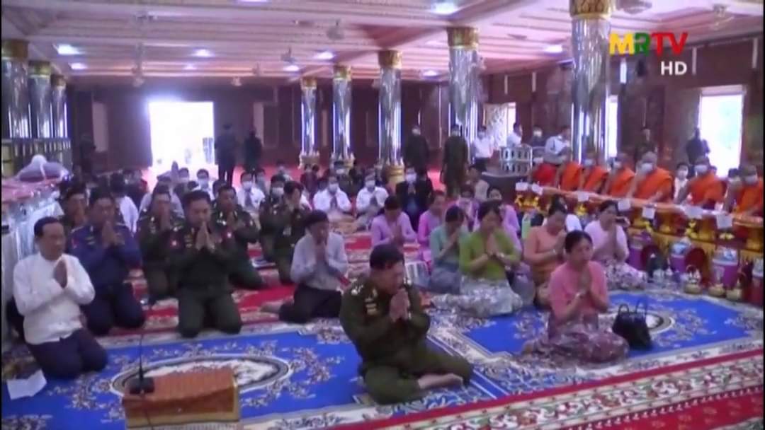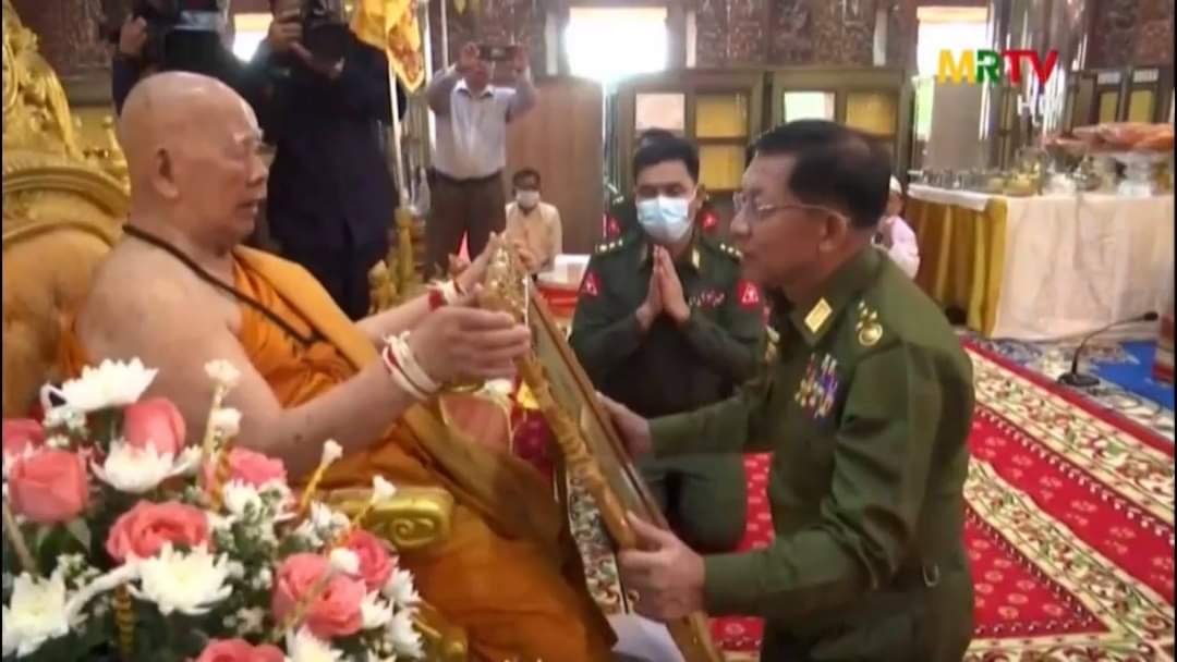 28 มี.ค.64 พล.อ.อาวุโส มินอ่องไหล่ง์ ประธาน SAC ไปถวายสมณศักดิ์ "อภิธชมหารฐคุรุ အဘိဓဇမဟာရဋဂုရု" (ด้านพระไตรปิฎก) แด่ ครูบาแสงหล้า ธัมมสิริ เจ้าอาวาสวัดพระธาตุสายเมือง ท่าขี้เหล็ก ออกโทรทัศน์ทหารวันที่ 28 อย่างเอิกเกริก