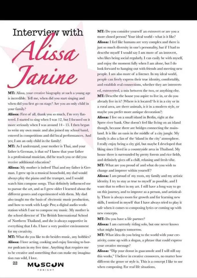 Alissa: อย่างแรกสุดเลย หนูอยากขอบคุณมากๆ รู้สึกเป็นเกียรติจริงๆ หนูเริ่มร้องเพลงตอนอายุ 12 แต่เริ่มมาตั้งใจจริงร้องจริงจังตอนอายุประมาณ 14-15 แล้วหนูก็เริ่มแต่งเพลงเอง เริ่มทำวงกับเพื่อน ๆ ในโรงเรียน เริ่มเข้าประกวดนั่นนี่และขึ้นแสดงในจังหวัด และใช่แล้วค่ะ หนูเป็นลูกคนเดียวค่ะ