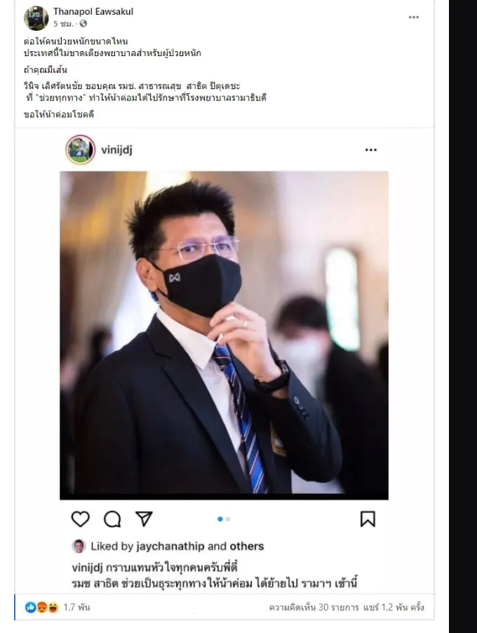 จากกรณี เฟซบุ๊ก "Thanapol Eawsakul" ของนายธนาพล อิ๋วสกุล บรรณาธิการสำนักพิมพ์ฟ้าเดียวกัน โพสต์ภาพแคปหน้าจอ อินสตาแกรม @vinijdj ของนายวินิจ เลิศรัตนชัย อดีตนักจัดรายการวิทยุ และนักธุรกิจจัดคอนเสิร์ต โพสต์ภาพนายสาธิต ปิตุเตชะ รมช.สาธารณสุข พร้อมข้อความระบุว่า "กราบแทนหัวใจทุกคนครับพี่ตี๋ รมช.สาธิต ช่วยเป็นธุระทุกทางให้น้าค่อม ได้ย้ายไป รามาฯ (โรงพยาบาลรามาธิบดี) เช้านี้" ซึ่งนายธนาพล กล่าวว่า "ต่อให้คนป่วยหนักขนาดไหน ประเทศนี้ไม่ขาดเตียงพยาบาลสำหรับผู้ป่วยหนัก ถ้าคุณมีเส้น วินิจ เลิศรัตนชัย ขอบคุณ รมช. สาธารณสุข สาธิต ปิตุเดชะ ที่ "ช่วยทุกทาง" ทำให้น้าค่อมได้ไปรักษาที่โรงพยาบาลรามาธิบดี ขอให้น้าค่อมโชคดี"