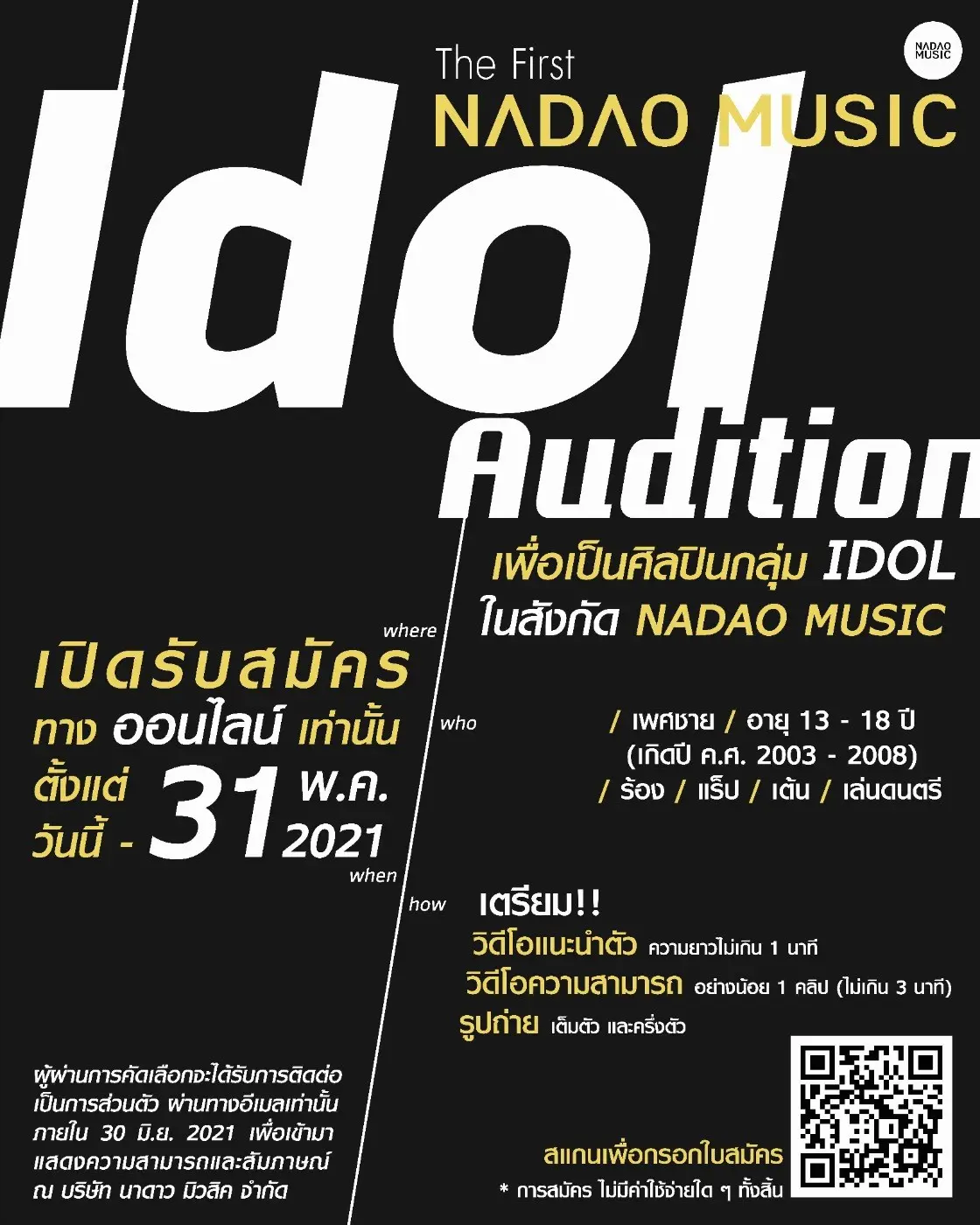 เป็นอีกโปรเจกต์ที่ไม่อยากให้พลาด!! เมื่อค่าย นาดาว มิวสิค เปิดโครงการ “The First Nadao Music Idol Audition” โดยเปิดรับสมัครออดิชั่น ค้นหาศิลปิน IDOL ชาย เพื่อเป็นศิลปินในสังกัด นาดาว มิวสิค โดยผู้ที่สนใจสามารถกรอกใบสมัครออนไลน์ ซึ่งไฟล์ที่ต้องแนบส่ง ได้แก่ คลิปวิดีโอแนะนำตัว ความยาวไม่เกิน 1 นาที พร้อมด้วยคลิปวิดีโอความสามารถ อย่างน้อย 1 คลิป ความยาวไม่เกินคลิปละ 3 นาที และรูปถ่ายแบบเต็มตัวและครึ่งตัว เปิดรับสมัครตั้งแต่ วันนี้ - 31 พฤษภาคมนี้ โดยไม่เสียค่าใช้จ่ายใด ๆ ทั้งสิ้น ซึ่งผู้ผ่านการคัดเลือกจะได้รับการติดต่อเป็นการส่วนตัวผ่านทางอีเมลเท่านั้น (ภายในวันที่ 30 มิถุนายนนี้) เพื่อเข้ามาแสดงความสามารถและสัมภาษณ์ ณ บริษัท นาดาว มิวสิค จำกัด