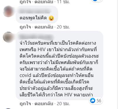 จำไว้นะครับคนที่เขาเป็นโรคติดต่อทางเพศหรือ HIV เขาไม่น่ากลัวเท่ากับคนที่ติดโควิตตอนนี้แล้วปิดบังข้อมูลตัวเองนะครับเพราะว่าถ้าไม่มีเพศสัมพันธ์กับเขาก็จะไม่สามารถติดเชื้อได้แต่ถ้าคนที่ติด covid แล้วปิดบังข้อมูลจะทำให้คนอื่นติดเชื้อได้แล้วคนที่ติดเชื้อเกิดมีโรคประจำตัวอยู่แล้วก็มีความเสี่ยงสูงที่จะเสียชีวิตได้เร็วกว่าโรค HIV หลายเท่า