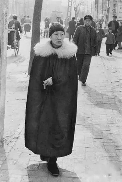 1957 ถนนหวังฝูจิ่ง ผู้หญิงชั้นสูงคนหนึ่งสวมเสื้อโค้ทสีดําและผ้าคลุมไหล่ขนสัตว์สีขาว มันค่อนข้างฟุ่มเฟือย