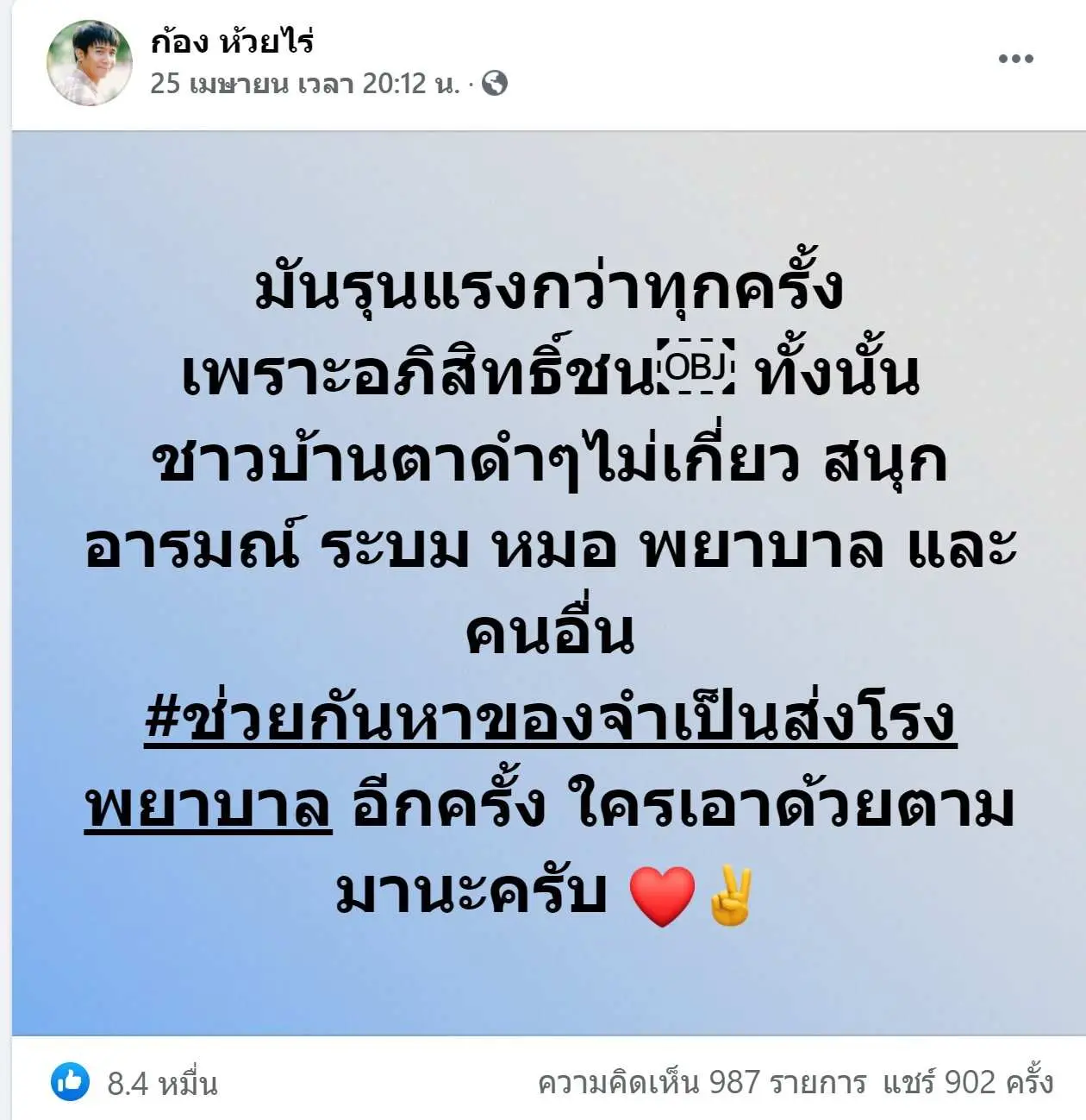 ก้อง ห้วยไร่ ออกมาโพสต์เฟซบุ๊กว่า "มันรุนแรงกว่าทุกครั้ง เพราะอภิสิทธิ์ชนทั้งนั้น ชาวบ้านตาดำ ๆ ไม่เกี่ยว สนุกอารมณ์ ระบม หมอ พยาบาล และคนอื่น #ช่วยกันหาของจำเป็นส่งโรงพยาบาล อีกครั้ง ใครเอาด้วยตามมานะครับ" "กำลังใจสำคัญมากๆ ครับ ในช่วงเวลานี้ เรามาพิมพ์ความรู้สึกดีๆและกำลังใจ มอบให้ หมอ และ พยาบาลกันครับ #ผมจะไม่รับบริจาคเหมือนทุกครั้ง เพราะแค่นี้พี่น้องเราก็ลำบากกันมากพอแล้ว
