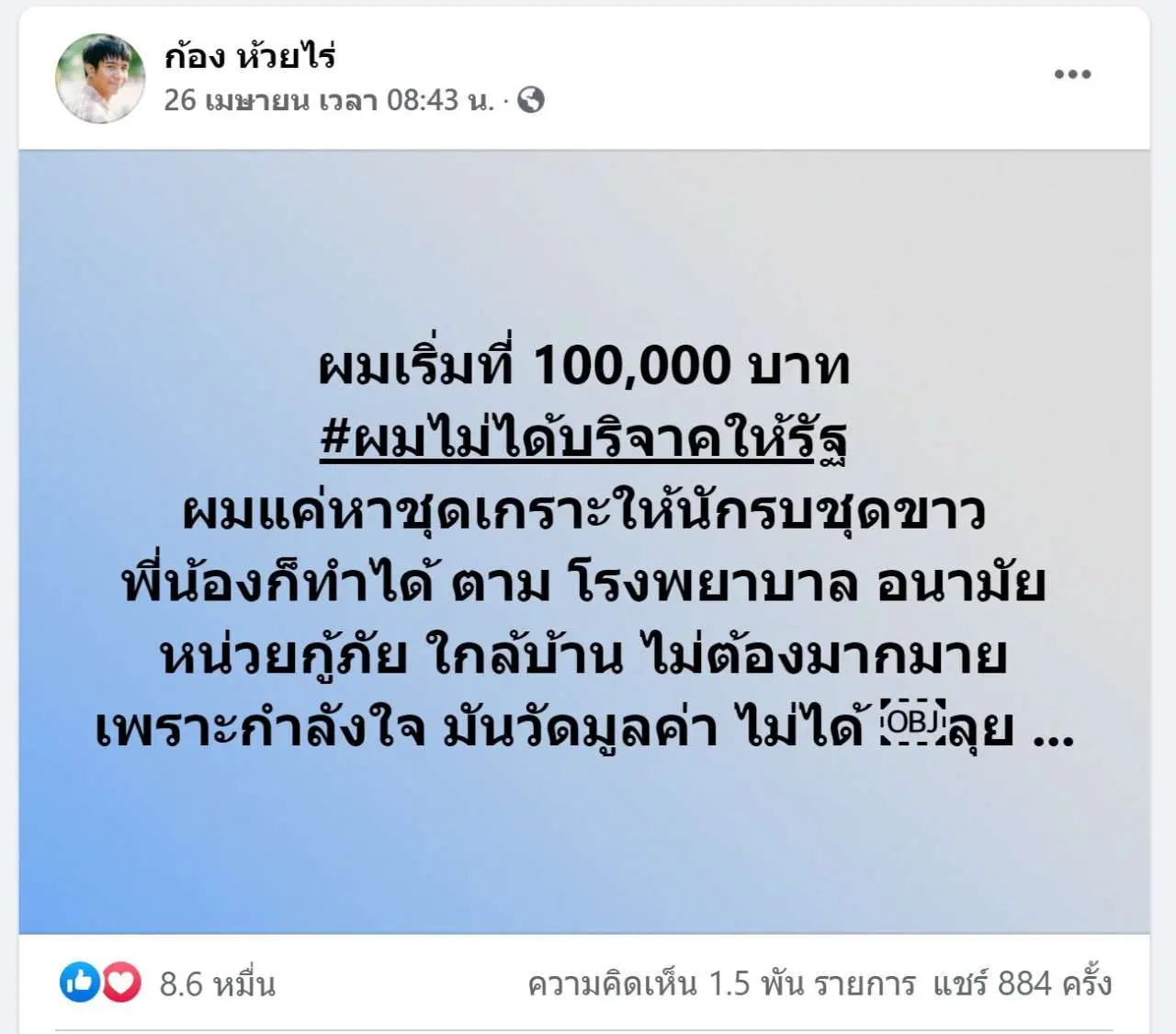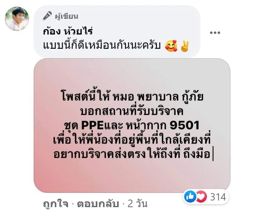 ส่วนผมและครอบครัวจะจัดหา ชุด PPE กับ หน้ากาก 9501 และน้ำดื่ม ไปมอบโรงพยาบาล ให้ได้มากที่สุดตามกำลังที่ผมพอมี สาธุ เอานำกันเด้อครับ รัก" "ผมเริ่มที่ 100,000 บาท #ผมไม่ได้บริจาคให้รัฐ ผมแค่หาชุดเกราะให้นักรบชุดขาว" "พี่น้องก็ทำได้ ตามโรงพยาบาล อนามัย หน่วยกู้ภัย ใกล้บ้าน ไม่ต้องมากมาย เพราะกำลังใจ มันวัดมูลค่า ไม่ได้ ลุย ผมไม่ได้รับบริจาคนะครับ #อยากให้พี่น้องที่อยากจะร่วมด้วย สามารถนำเอาชุด PPE ไปมอบให้กับโรงพยาบาล อนามัย หรือ กู้ภัยใกล้บ้านได้เลยครับ หรือใครไม่สะดวกผ่านมาทางสนามฟุตบอลผมก็ฝากไว้หน้าสนามได้เลยนะครับผมจะนำไปส่งต่อให้แต่ไม่รับเป็นเงิน ขอบคุณครับ"