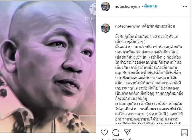 หลับพักผ่อนนะเพื่อน มึงกับกูเป็นเพื่อนกันมา 50 กว่าปี( ตั้งแต่เด็กๆอายุสิบกว่าๆ ) ตั้งแต่ลำบากมาด้วยกัน เช่าห้องอยู่ด้วยกัน นอนตัวเบียดกัน นุ่งกางเกงตัวเดียวกัน ( เปลี่ยนกันนุ่งเช้าเย็น ) เช้ามึงนุ่ง กูอยู่ห้องใส่ผ้าขาวม้ารอนุ่งตอนบ่าย)กินราดหน้าห่อเดียวกัน เอาข้าวก้นหม้อในโรงลิเกผสมคลุกกับก๋วยเตี๋ยวเพื่อกินให้อิ่ม “มีเงินยี่สิบบาทยังแบ่งคนละสิบบาท นอนตามโต๊ะสนุ๊ก “ เพราะไม่มีที่นอน” นอนตามรถบัสลิเกบรรหาญ”เพราะไม่มีที่ไป” มึงตีกลองกูเป็นตัวตลกลิเก มึงนั่งดูกู จำมุกกูกูลืมมุกมึงก็จะตะโกนบอกมุกกู เราเคยคุยกันว่า สักวันเราจะมีเมีย เราจะไม่ให้ลูกเมียลำบากเหมือนเรา และเราก็ทำได้ แต่ใช้เวลานานมาก ( หลายสิบปี ) และยังมีอีกมากมายคงบรรยายได้ไม่หมด เพราะตอนนี้พิมพ์ไปร้องไห้ไป ( กูไม่เคยร้องไห้มานานมากแล้วนะไอ้ค่อม) คบกันตั้งแต่ลำบาก พอสบายก็มาตายจาก” กูจะคิดถึงมึง และนึกถึงมึงตลอดไป พักผ่อนนะเพื่อนรัก😭โลกนี้คือละคร”