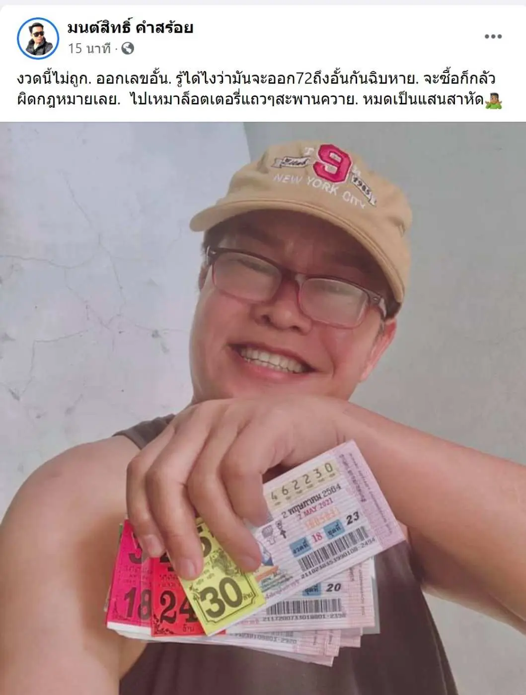 โดยวันนีี้ 2 พ.ค. 2564 มนต์สิทธิ์ คำสร้อย โพสต์เฟซบุ๊กว่า "งวดนี้ไม่ถูก ออกเลขอั้น รู้ได้ไงว่ามันจะออก 72 ถึงอั้นกัน -ิบหาย จะซื้อก็กลัวผิดกฎหมายเลย ไปเหมาล็อตเตอรี่แถวๆ สะพานควาย หมดเป็นแสนสาหัส"