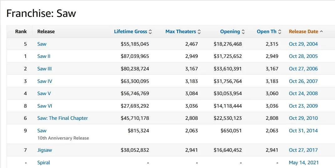 และนี่คือประวัติผลงานเรียงตามลำดับเวลาการฉายที่สหรัฐอเมริกาของภาพยนตร์ชุด SAW ครับ