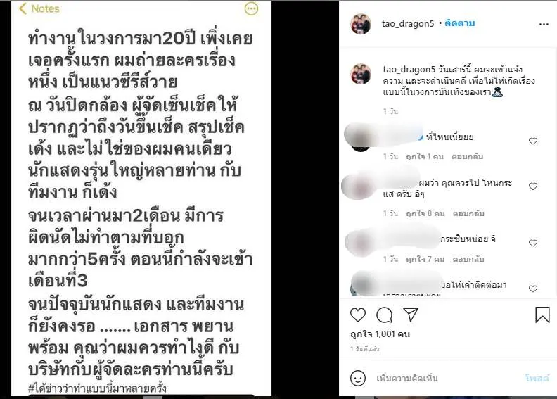 ดราก้อนไฟว์ โพสต์ไอจี หลังถูกผู้จัดละครรายหนึ่ง จ่ายเช็คเด้ง ทั้ง ผิดนัดมากว่า 5 ครั้งแล้ว แฉนักแสดงรุ่นใหญ่ทีมงานโดนกันหมด ระบุไว้ว่า