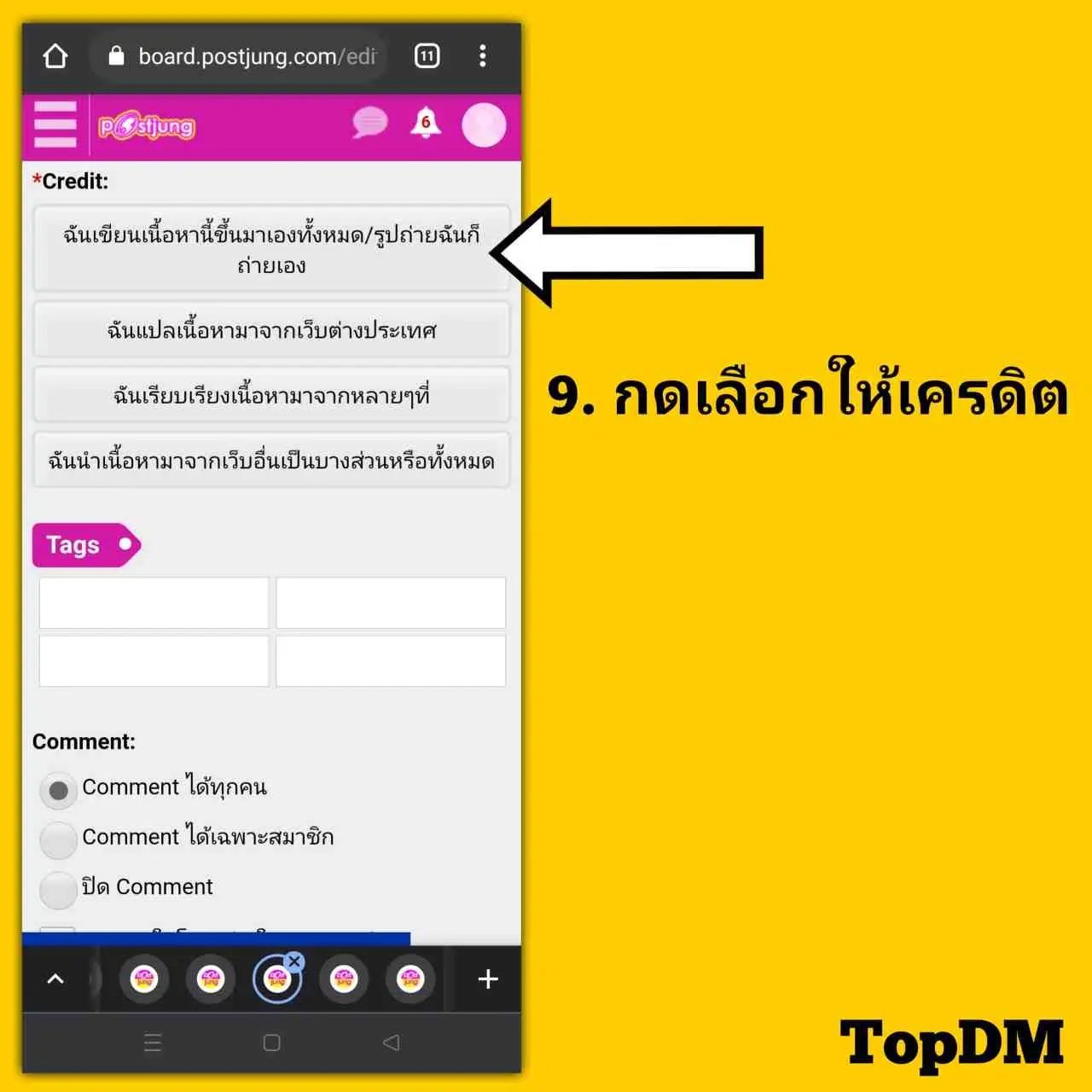 ในขั้นตอนนี้ เมื่อเราเขียนบทความ แทรกรูปเสร็จเรียบร้อย ให้มากดเลือกให้เครดิตฮะ