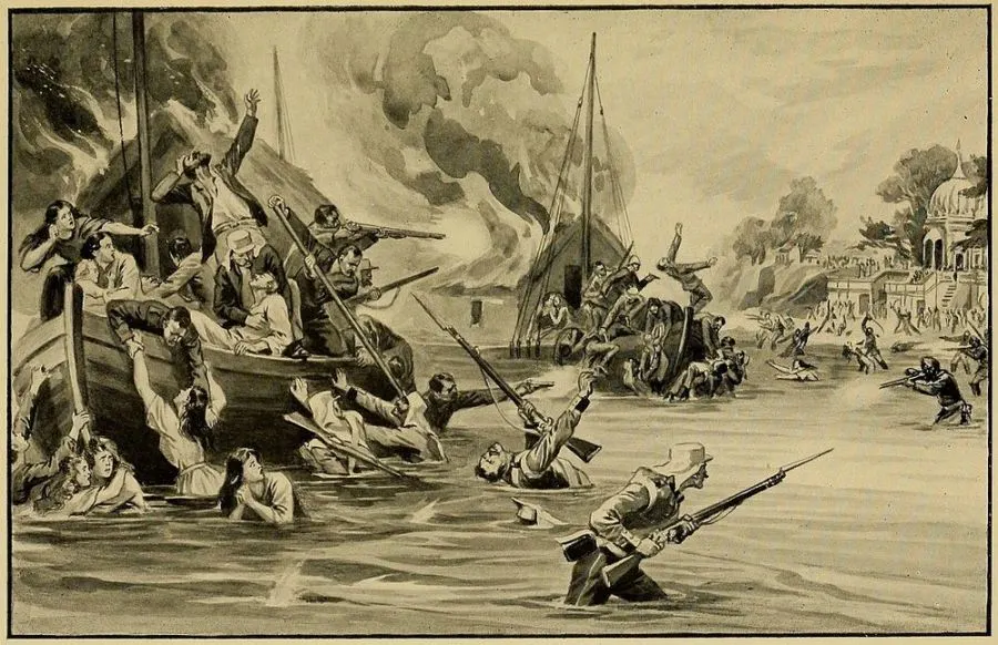 กองทัพเรือของอินเดียโจมตีเรือของเจ้าหน้าที่อังกฤษและครอบครัวที่หลบหนีในระหว่างการปิดล้อมเมือง Cawnpore ในปีพ. ศ. 2407
