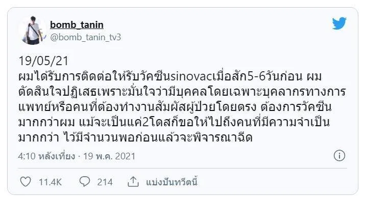 เต๋า ทีวีพูด นักข่าวดัง แฉแล้ว ข่าว ดารา แห่ ฉีดแวคซีน เผยว่า ตัวเองสงสัยว่า ข่าวลือที่ออกมาว่า ดาราที่แห่ไปฉีดแวคซีนแล้วถ่ายรูปลงโซเชี่ยลมีเดีย แล้วมีลับลมคมในนั้น จากประสบการณ์ส่วนตัวนั้น ดาราส่วนใหญ่จะมีความเป็นส่วนตัวสูง เวลาไปสถานพยาบาลหรือ คลินิกศัลยกรรมมักจะไม่ถ่ายรูปหรือแม้แต่ให้คนรู้ แถมทำไมดาราเหล่านี้ได้ฉีดก่อนคนอื่นๆ หรือว่ามีเหลือเยอะ ตนจึงคิดว่ามัน แปลกๆ บางคนถึงขั้นฉีด sinovac แวรซีนที่มีข่าวไม่ค่อยดี บางคนอาจสงสัยว่า ดาราเหล่านี้ฉีดจริงหรือไม่