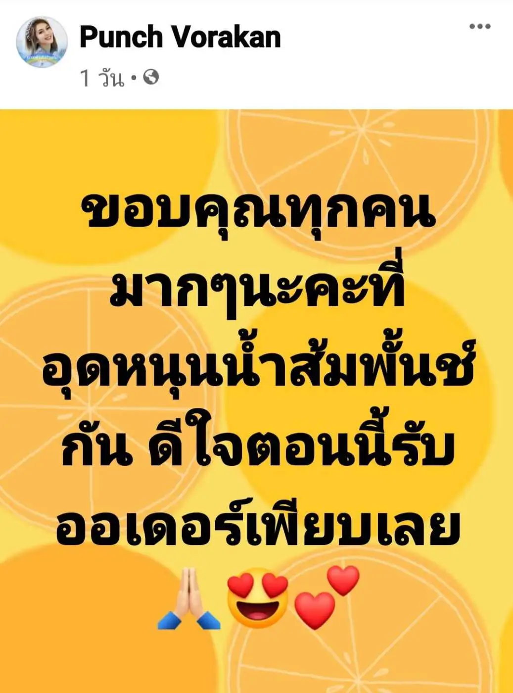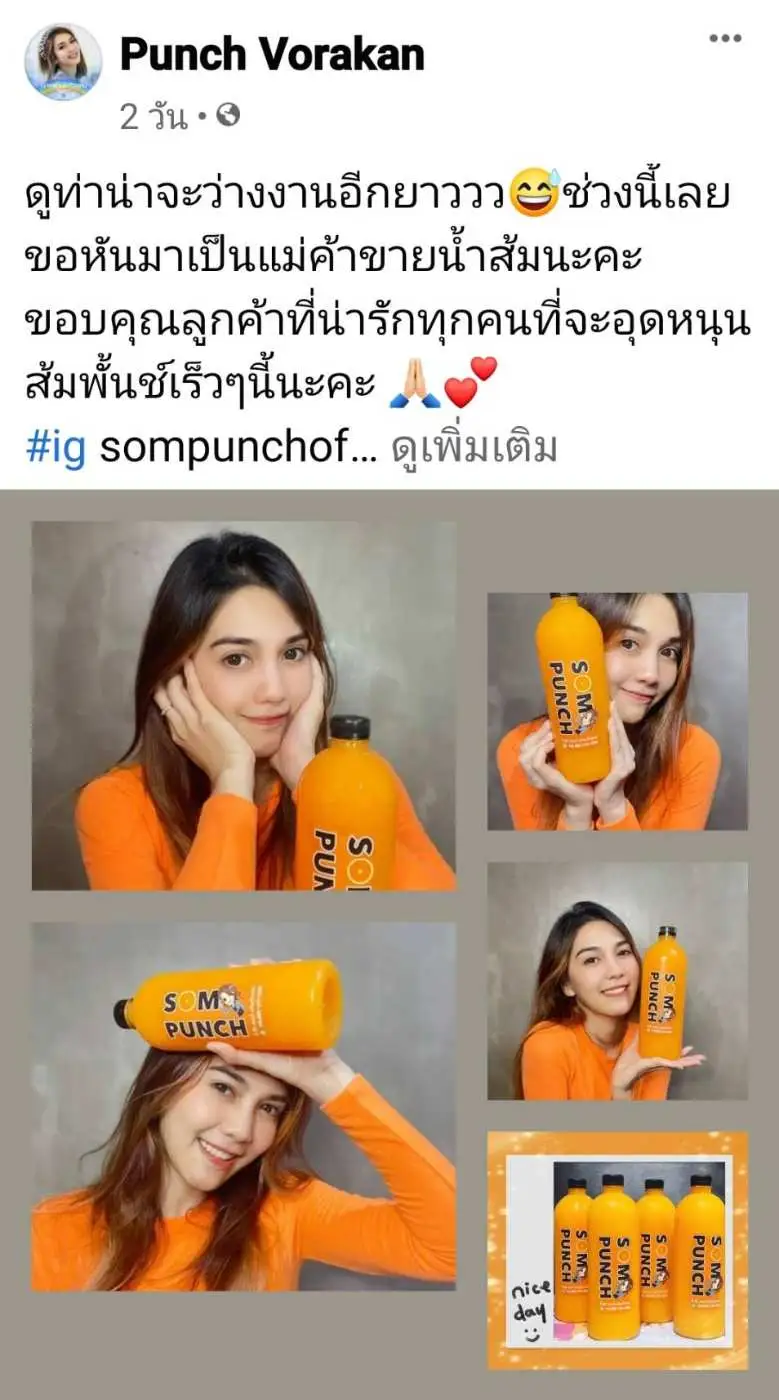 สาวพั้นซ์เลยประกาศให้โลกรู้ว่าขายน้ำส้มจ้า!! “ดูท่าน่าจะว่างงานอีกยาววว......ช่วงนี้เลยขอหันมาเป็นแม่ค้าขายน้ำส้มนะคะ น้ำส้มแท้สายน้ำผึ้ง+โชกุนสกัดเย็นผสมเนื้อส้มแท้ 100 เปอร์เซ็นต์นะคะ ขอบคุณลูกค้าที่น่ารักทุกคนที่จะอุดหนุนน้ำส้มพั้นช์นะคะ”