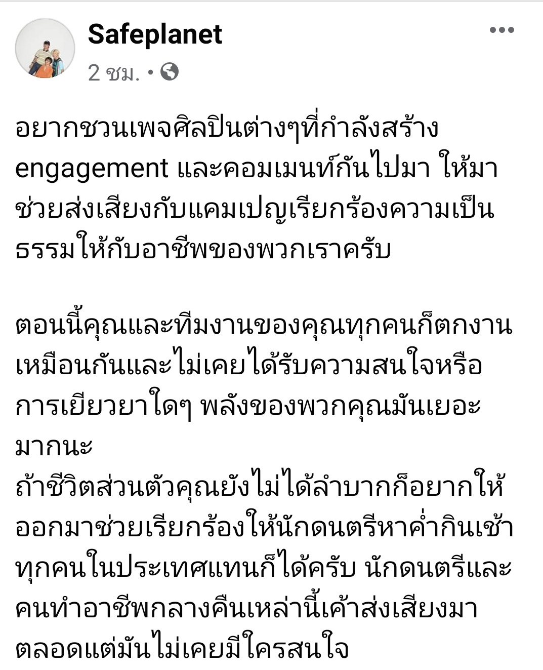 วงรุ่นน้อง Safeplanet ยิ่งไปไกลกว่านั้น โดยการเชิญชวนศิลปินร่วมอาชีพออกมาร่วมลงชื่อกดดันรัฐบาล เพื่อเรียกร้องความเป็นธรรมให้แก่อาชีพนักดนตรี รวมถึงผู้ประกอบอาชีพอิสระและภาคธุรกิจรายย่อยที่ได้รับผลกระทบจากการบริหารจัดการ โควิด19 ของรัฐบาล