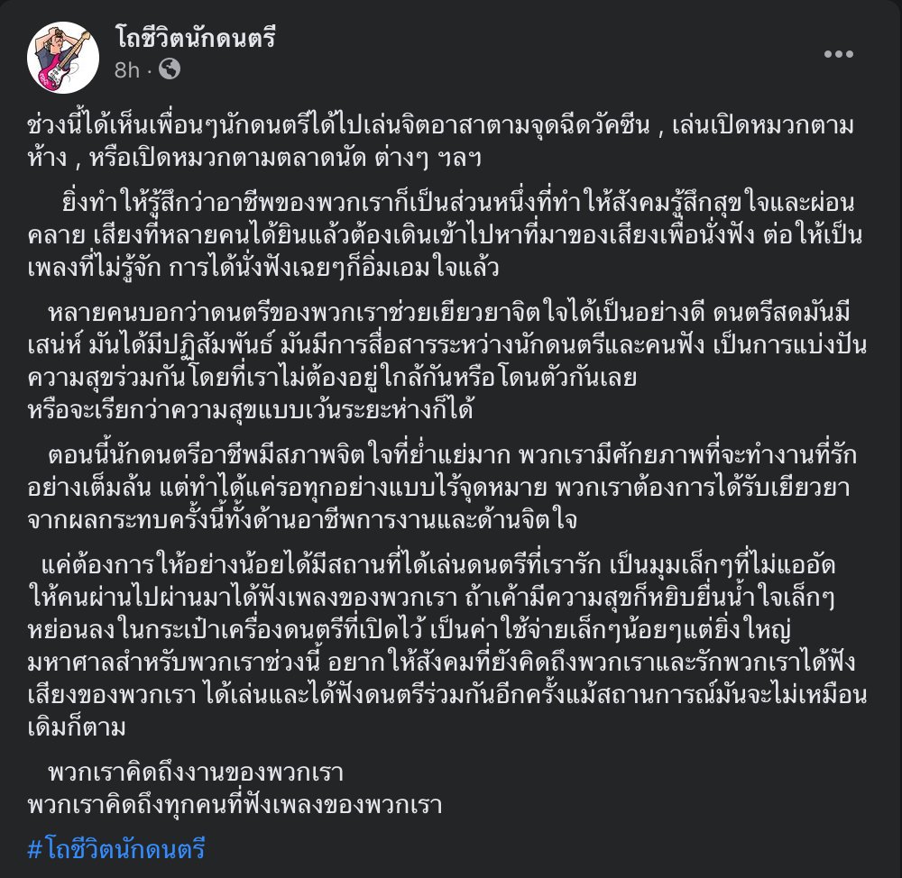 ทั้งสามวงสะท้อนปัญหาของนักดนตรีอาชีพในตอนนี้ โดยใช้พื้นที่เพจเฟซบุ๊กและจำนวน followers ให้เป็นประโยชน์กับเพื่อนร่วมอาชีพ