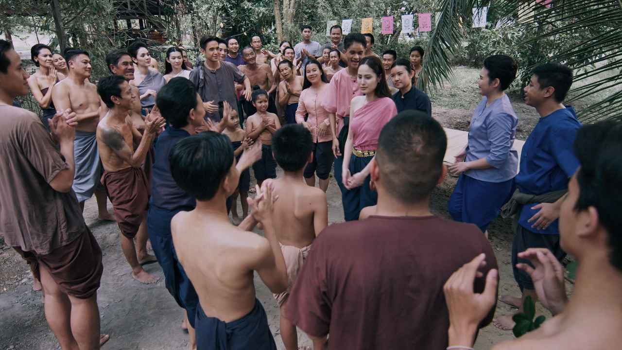 โดยฉากที่นากและมากได้เจอกันเป็นครั้งแรก เกิดขึ้นในงานประจำปีของวัดในหมู่บ้าน เมื่อ นาก (ขวัญ อุษามณี) ได้เดินทางมาทำบุญกับพ่อพร้อม (นึกคิด บุญทอง) และแม่นวล (เปิ้ล-ชไมพร สิทธิวรนันท์) พร้อมด้วยบ่าวคนสนิทอย่าง ปรุง (หญิง-อภิสรา รักชาติ) และในขณะที่นากได้แยกตัวกับพ่อแม่และไปเดินเที่ยวในวัดกับปรุงก็บังเอิญไปเจอกับไอ้มาก และถูกอีกฝ่ายร้องเพลงเกี้ยว ทำให้สาวเจ้าเกิดอาการเขินอาย เพียงสบตาทั้งสองก็มีใจให้กัน โดยมีปรุงเป็นแม่สื่อให้มาก