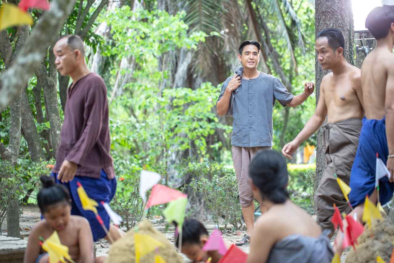 เบื้องหลังฉากนี้ทีมงานยกกองกันไปถ่ายทำกันที่ วัดละมุด จังหวัดนครปฐม โดยได้เนรมิตบริเวณรอบๆ วัด ให้กลายเป็นงานวัดย่อมๆ ที่มีการละเล่นมากมาย โดยในซีนนี้ค่อนข้างวุ่นวายพอสมควร เพราะมีนักแสดงเข้าฉากเยอะ ทำให้ผู้กำกับต้องเรียกทั้งขวัญและนิวมาซักซ้อมก่อนถ่ายจริง แต่ด้วยความเป็นมืออาชีพของทั้งคู่ทำให้ทุกอย่างผ่านไปด้วยดี ซึ่งความสำคัญของฉากนี้คือจะเป็นการพบกันของมากและนางเป็นครั้งแรก และเป็นจุดเริ่มต้นของความรักของทั้งคู่ จนกลายเป็นโศกนาฏกรรมรักอมตะแห่งทุ่งพระโขนง ที่ถูกเล่าขานมาจนปัจจุบัน ติดตามฉากนี้ได้ในซีรีส์แม่นากพระโขนง