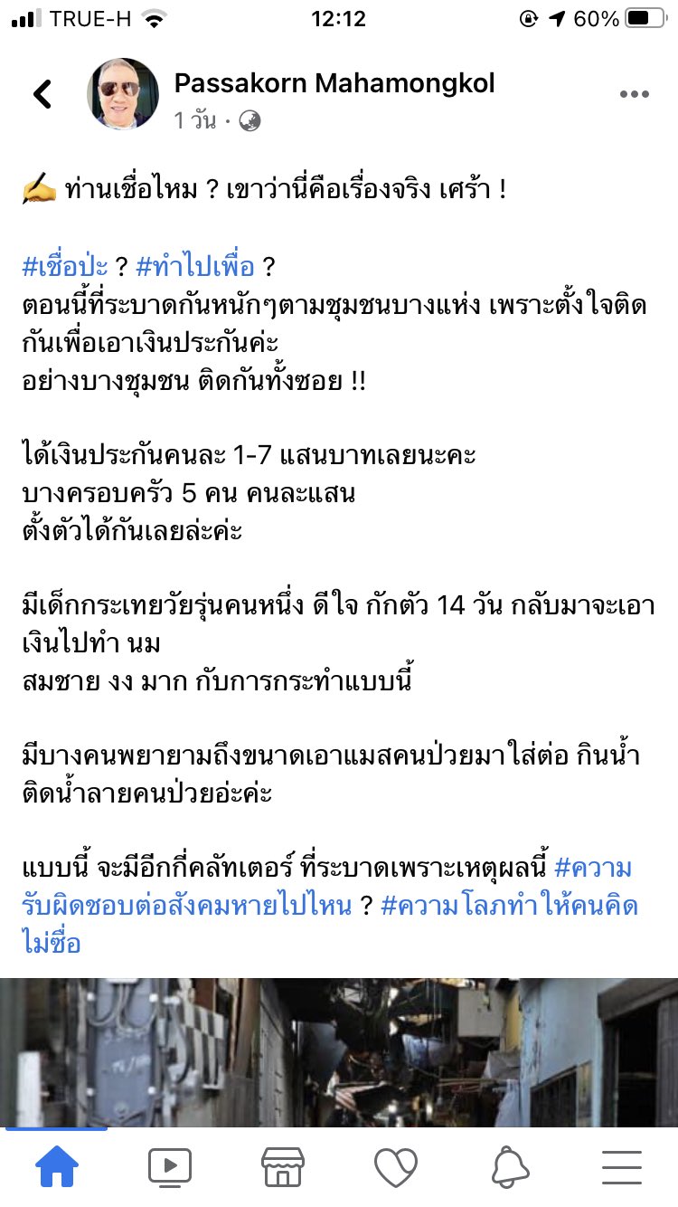 - คนกลัวโควิดกันจะตายห่า ไม่มีใครอยากติดหรอกเอาจริง แต่ถ้ามีคนทำแบบนี้จริงๆก็สะท้อนอะไรรู้มั้ย? สะท้อนว่ารัฐมันห่วยแตก บริหารเ...้ยไรไม่ได้เลย คนขาดรายได้ ค้าขายไม่ออก ชนชั้นกลางยังไปต่อไม่ไหว การเอาสุขภาพเข้าแลกบางคนถึงมองว่าคุ้มอะ จะมองทางไหนก็หดหู่นะปันปัน