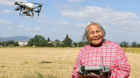 คุณยายสุดเจ๋งใช้โดรนให้ปุ๋ยพืชผลทั่วไร่ผลไม้