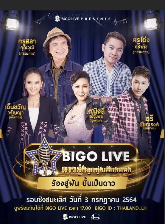 และในรอบชิงชนะเลิศนี้ ได้รับเกียรติจากครูสลา คุณวุฒิ และครูโด่ง ธชาทัช สิงหะพล มาเป็นกรรมการตัดสินเพื่อเฟ้นหาผู้ชนะของทั้ง 5 รางวัล ที่ผู้ชมทางบ้านก็สามารถมีส่วนร่วมในการโหวตผ่านแอปฯได้เช่นกัน ท่านสามารถรับชมและเข้าร่วมการประกวด “BIGO ดาวรุ่งลูกทุ่งเสียงทอง” ผ่านแอป Bigo Live โดยสามารถดาวน์โหลดได้ ที่นี่ (พร้อมใช้งานบน iOS และ Android)