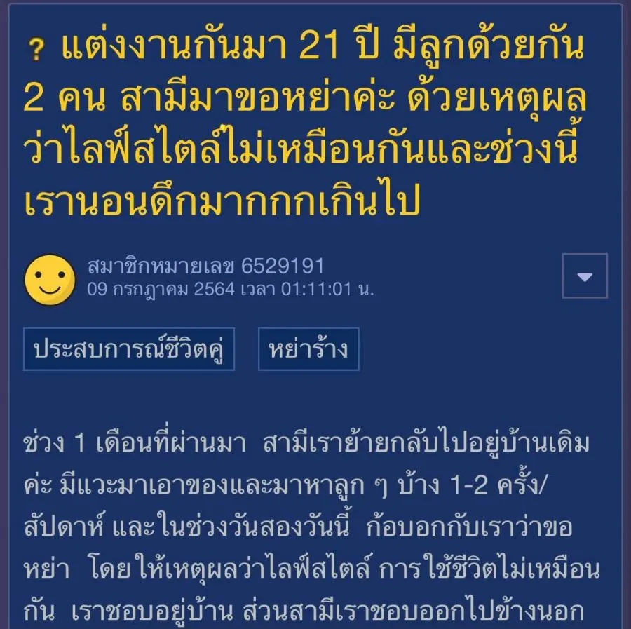 แต่งงานกันมา 21 ปี มีลูกด้วยกัน 2 คน สามีมาขอหย่าค่ะ ด้วยเหตุผลว่าไลฟ์สไตล์ไม่เหมือนกันและช่วงนี้เรานอนดึกมากกกเกินไป