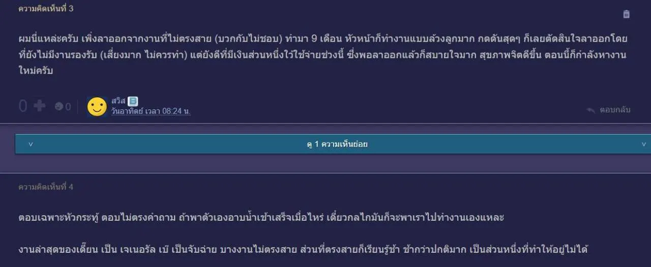 ผมนี่แหล่ะครับ เพิ่งลาออกจากงานที่ไม่ตรงสาย (บวกกับไม่ชอบ) ทำมา 9 เดือน หัวหน้าก็ทำงานแบบล้วงลูกมาก กดดันสุดๆ ก็เลยตัดสินใจลาออกโดยที่ยังไม่มีงานรองรับ (เสี่ยงมาก ไม่ควรทำ) แต่ยังดีที่มีเงินส่วนหนึ่งใว้ใช้จ่ายช่วงนี้ ซึ่งพอลาออกแล้วก็สบายใจมาก สุขภาพจิตดีขึ้น ตอนนี้ก็กำลังหางานใหม่ครับ