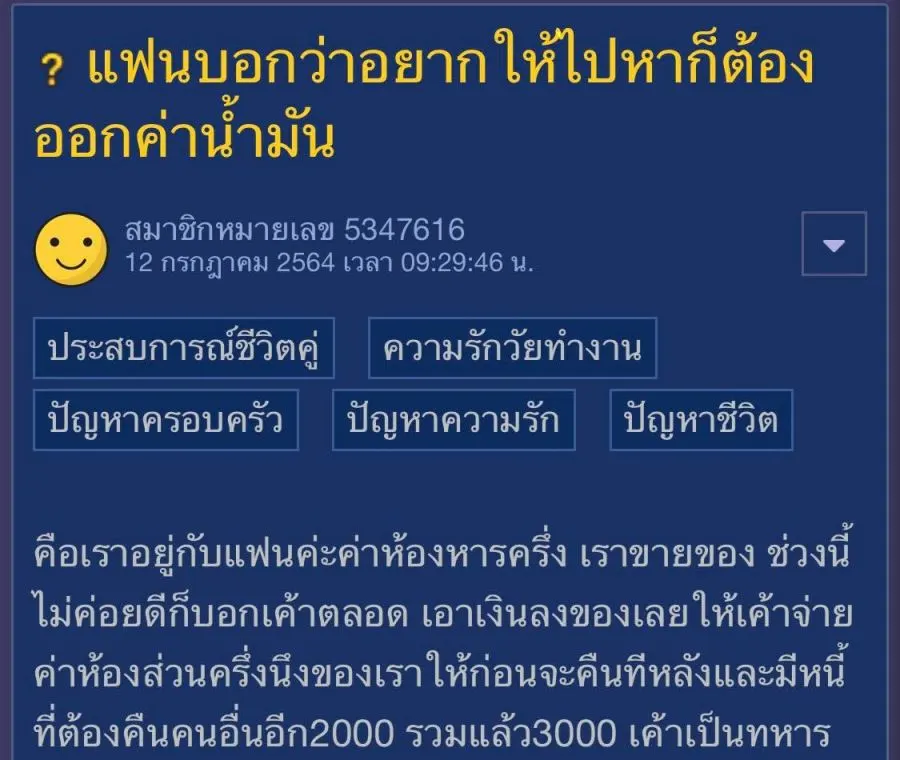 คือเราอยู่กับแฟนค่ะค่าห้องหารครึ่ง เราขายของ ช่วงนี้ไม่ค่อยดีก็บอกเค้าตลอด เอาเงินลงของเลยให้เค้าจ่ายค่าห้องส่วนครึ่งนึงของเราให้ก่อนจะคืนทีหลังและมีหนี้ที่ต้องคืนคนอื่นอีก2000 รวมแล้ว3000 เค้าเป็นทหารทุกครั้งที่มาหาต้องออกค่าน้ำมันให้เพราะไม่มีตังเราเองก็บอกให้มาหานะคะ มาก็กินข้าวส่วนใหญ่เราออกเค้าจะออกตอนเงินออก2-3วันหลังจากนั้นเงินเดือนเอาไปจ่ายภาระต่างๆจนหมด(หมดจริงๆ) เวลานั้นจะบอกว่าวันนี้มาหาได้(ด้วยงานมาหาไม่ได้ทุกวันเลย และไกลนิดนึง) ถ้าเราให้มาก็ต้องออกค่าน้ำมันให้ ค่ากินเราจ่าย เพราะเงินเค้าหมดเลยจ่ายค่าภาระต่างๆไป ช่วงเราไม่มีงานเค้าก็ให้เงินเรานะคะ ค่าห้องน้ำไฟค่ากินเราเค้าออกหมด พอช่วงหลังเงินเดือนเค้าหมดไปกับภาระต่างๆเป็นเราที่คอยให้เงินกินส่งของให้กิน เราไม่มีเค้าก็แบกทั้งเดือนพอเราตั้งตังได้มาขายของเค้าไม่มีเราก็แบกเค้า แต่บางทีก็แอบคิดว่าที่ต้องให้ค่าน้ำมันทุกครั้ง เค้าพูดว่าเพราะเราอยากให้ไปหาเราก็ต้องจ่าย เรารู้สึกว่าคำนี้มันแปลกๆยังไงไม่รู้ ขอความเห็นทุกคนหน่อยค่ะ