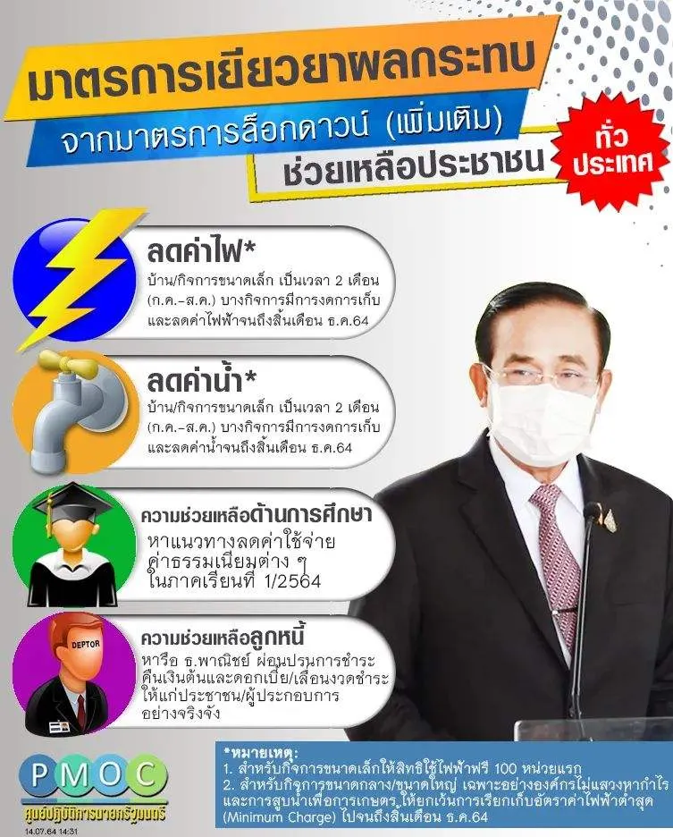 เนื่องจากที่ผ่านมา ได้ดีข่าว ผู้ที่ได้รับผลกระทบจากสถานการณ์โควิด ยังไม่ได้จ่ายค่าไฟ ค่าน้ำรวมถึงคนบ่นเรื่องค่าเทอมที่เรียนออนไลน์แต่ยังจ่ายค่าเทอมเหมือนเดิมดังนั้นรัฐบาลไม่นิ่งนอนใจ จึงได้ออกมาตรการช่วยเหลือประชาชน ทั่วประเทศดังนี้