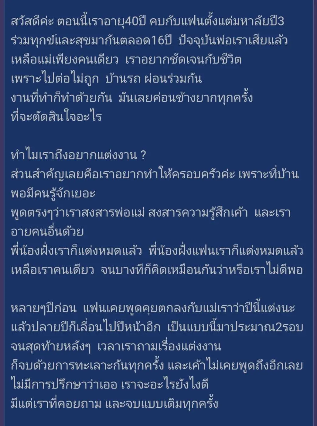 แต่สำหรับสาวรายนี้ รอมาถึง 16 ปี ผู้ชายก็ยังไม่พร้อมที่จะแต่งงาน เธอเริ่มที่จะท้อแล้ว ทำไมไม่แต่งสักที เพราะว่า ทางบ้านเธอเขาก็แต่งกันหมดแล้ว และเธอก็เริ่มที่จะอายชาวบ้านเขาแล้ว ที่อยู่ด้วยกันโดยยังไม่ได้แต่งงาน เธอเลยโพสต์ระบาย ใน Pantip