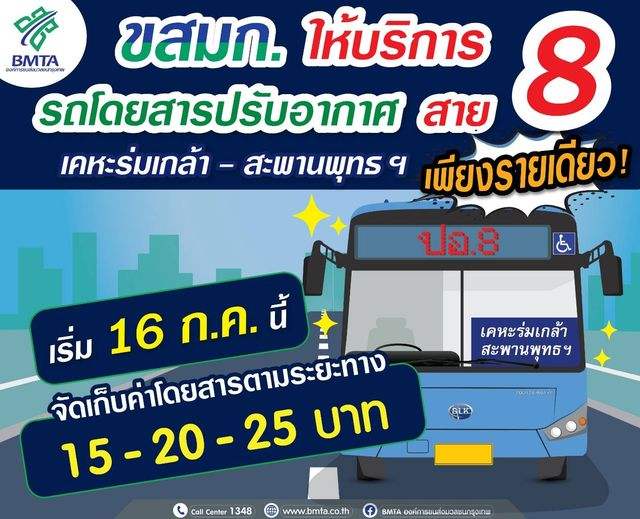 ขสมก. เปิดเส้นทางเดินรถโดยสารปรับอากาศ สาย 8 เคหะชุมชนร่มเกล้า - สะพานพระพุทธยอดฟ้า