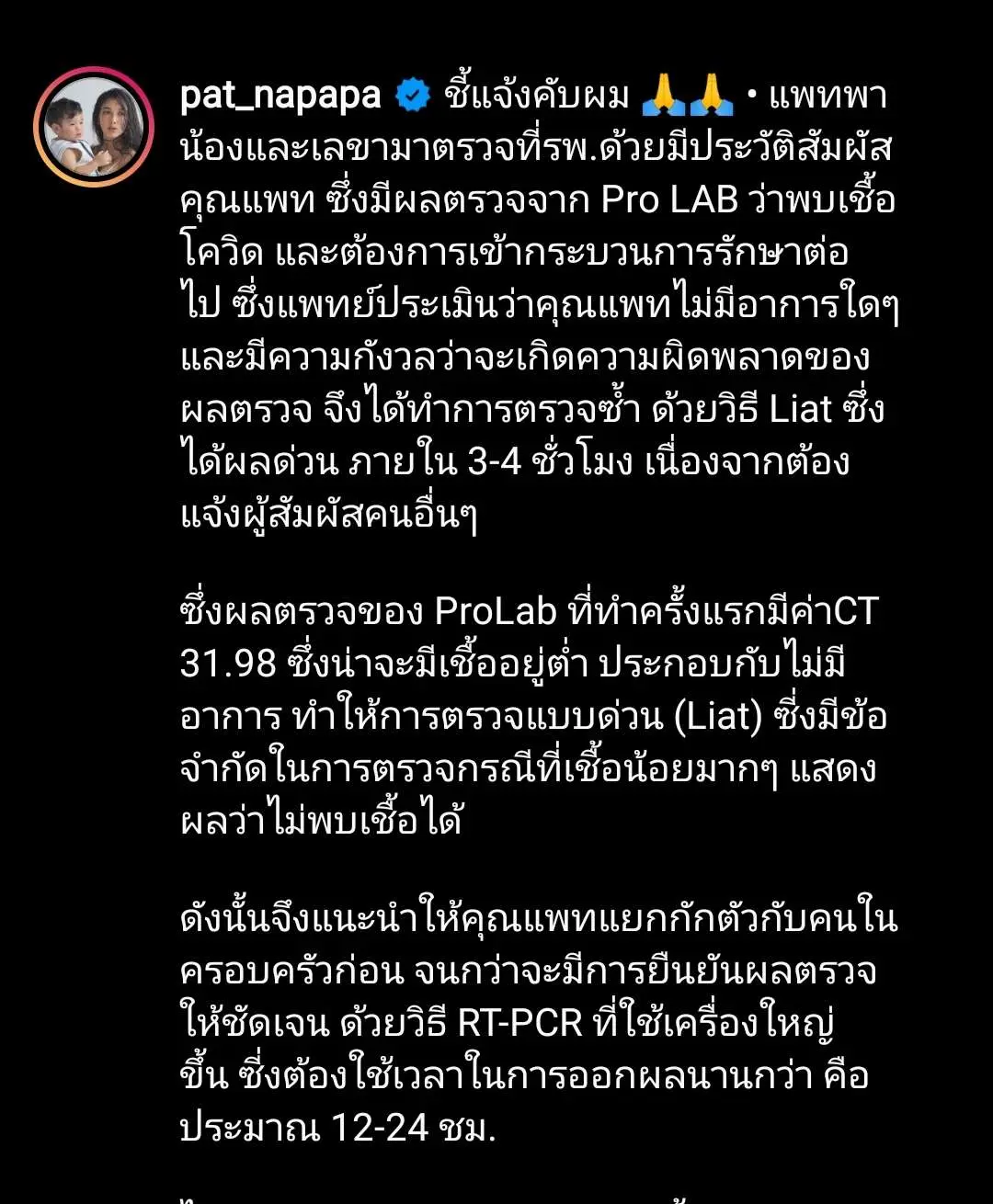 "แพท ณปภา" ไลฟ์สดแจ้งไม่เคยติดเชื้อโควิด-19