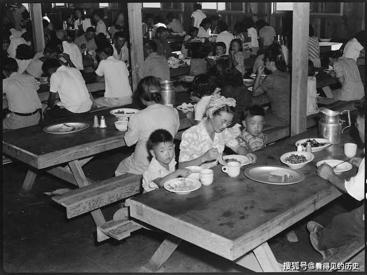 5. คนอเมริกันเชื้อสายญี่ปุ่นกำลังรับประทานอาหารในค่ายกักกันในมานซานัล แคลิฟอร์เนีย 2 กรกฎาคม พ.ศ. 2485