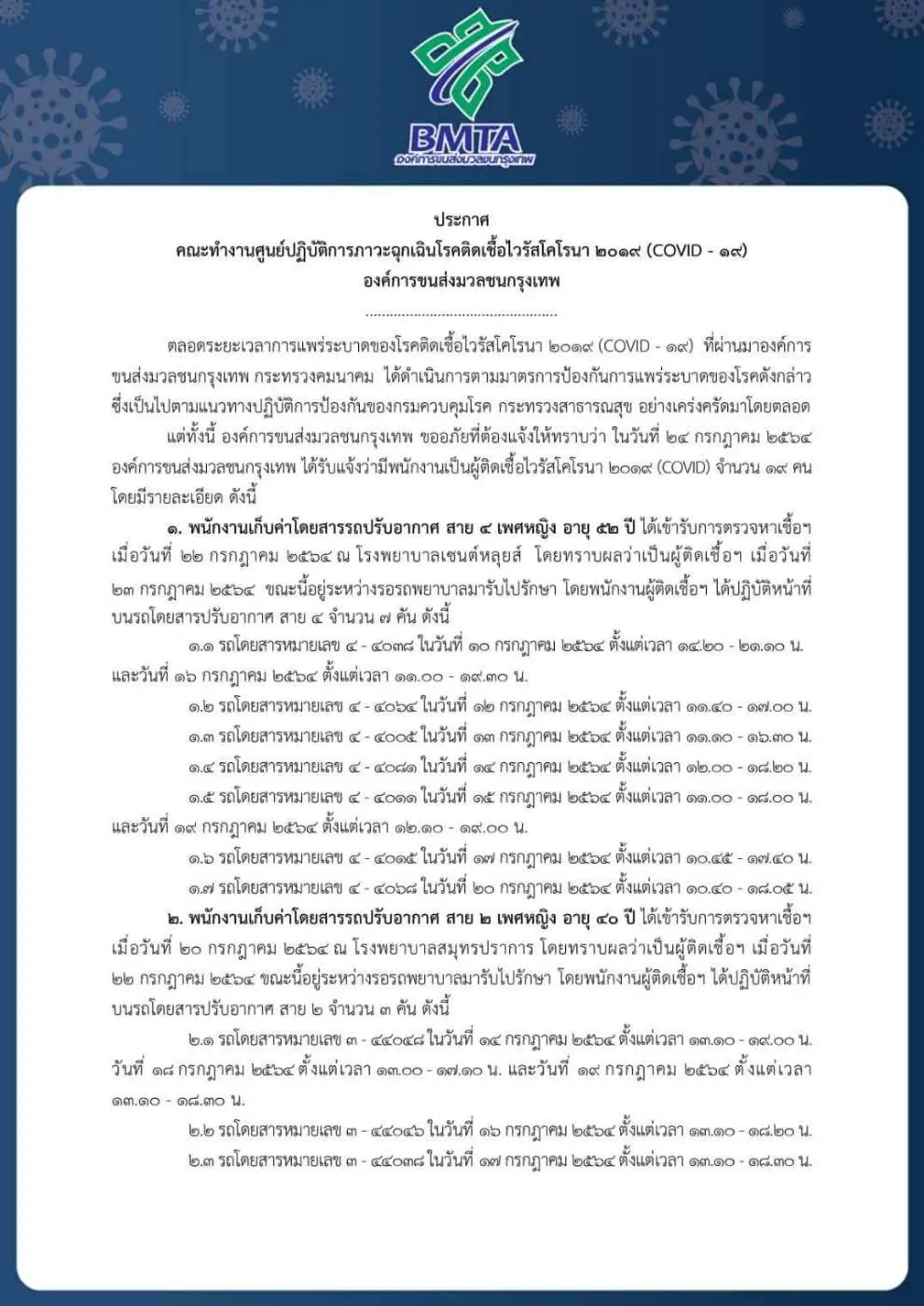 ประกาศ ขสมก. ประจำวันที่ 24 กรกฎาคม 2564 พบพนักงานติดเชื้อไวรัส COVID-19 จำนวน 19 ราย