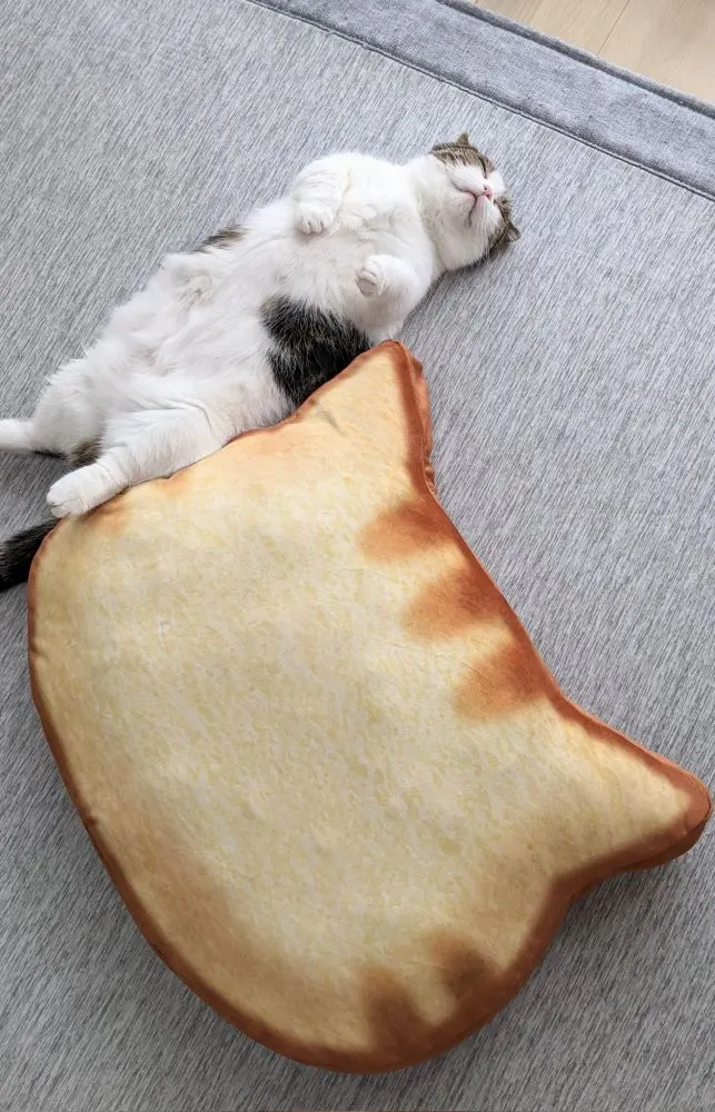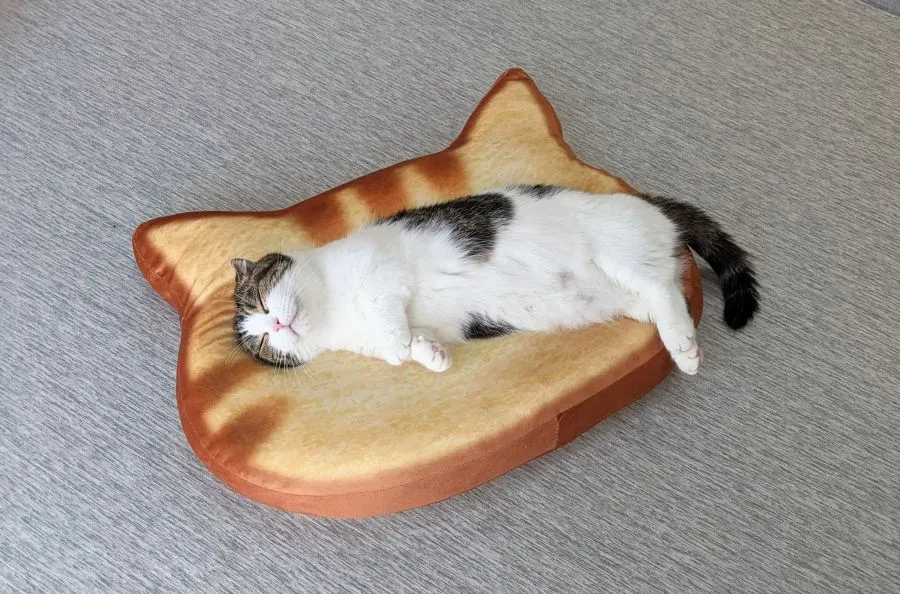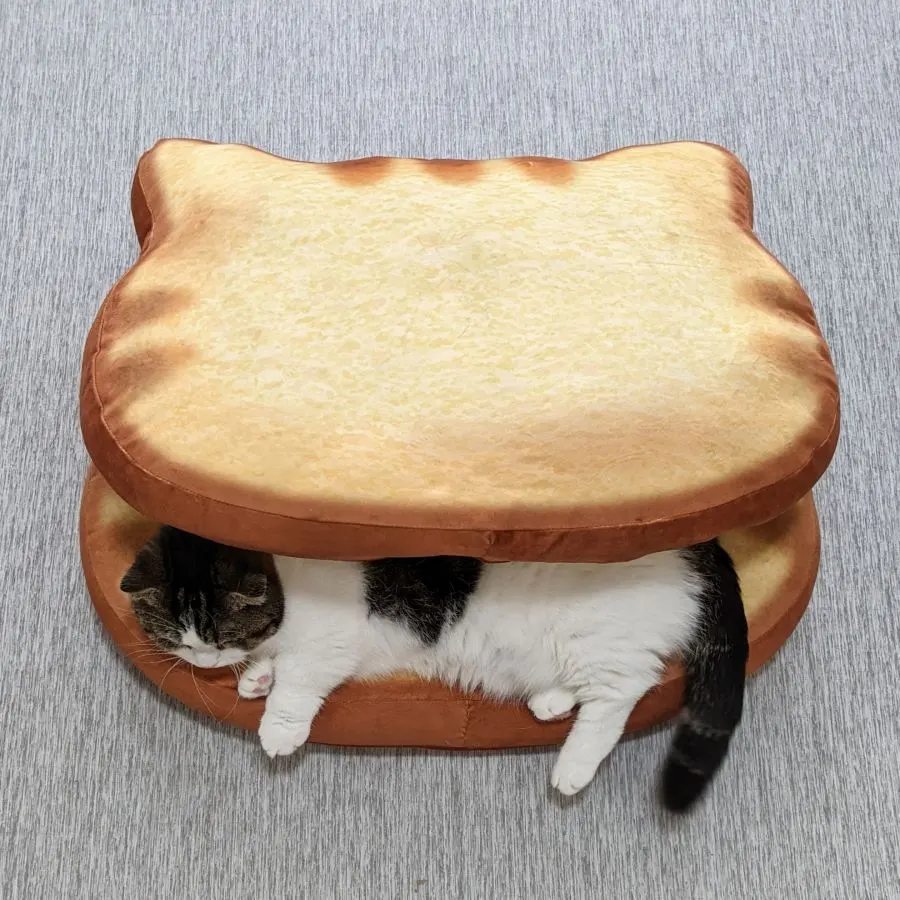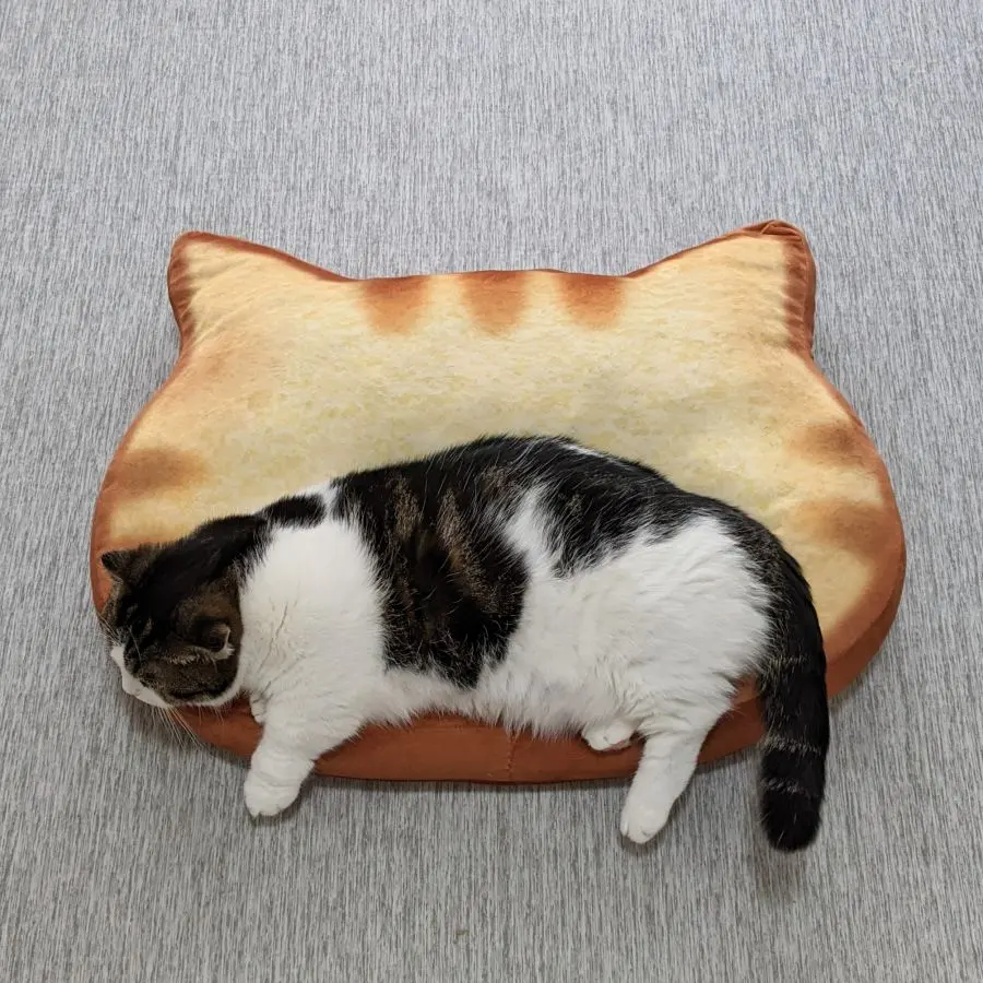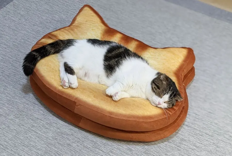 เจ้าของแมวจากทวิตเตอร์ @goma_tetsuro อวดไอเท็มน่ารัก เป็นเบาะขนมปังทรงหน้าแมว ที่พอแมวลงไปนอนแล้วก็เหมือนขนมปังหน้าแมว หรือไส้แมวพอดีเลย น่ารักน่าเอ็นดูเป็นที่สุดเลยล่ะ