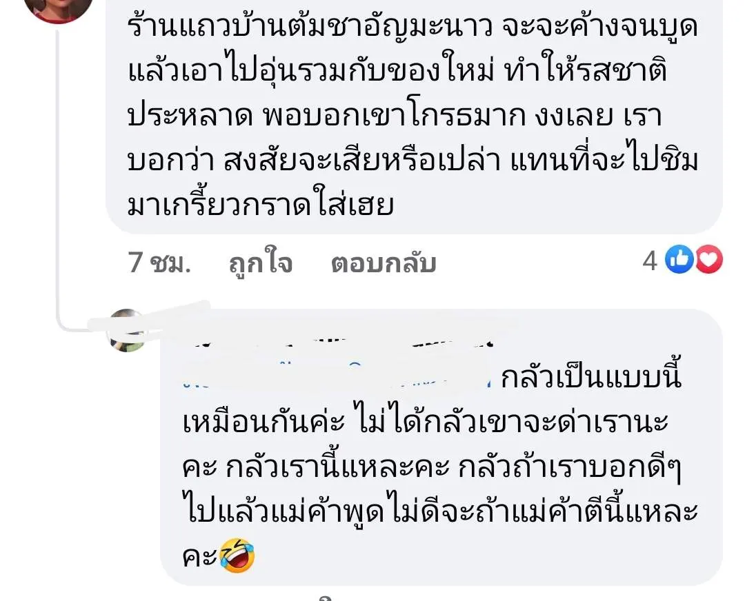 แต่ถ้ารักกันจริงควรเตือนนะ เพราะสาเหตุที่บางร้านเจ๊งเพราะ ไม่มีใครกล้าบอกความผิดพลาดร้านก็ชะล่าใจ เพราะเขาไม่เคยพลาดเลยบางครั้งทำให้ระบบการเช็คของก่อนขายในช่วงแรกๆหายไป..คิดว่าไม่มีปัญหาเพราะสินค้าวัตถุดิบสั่งจากที่เดิมๆ...