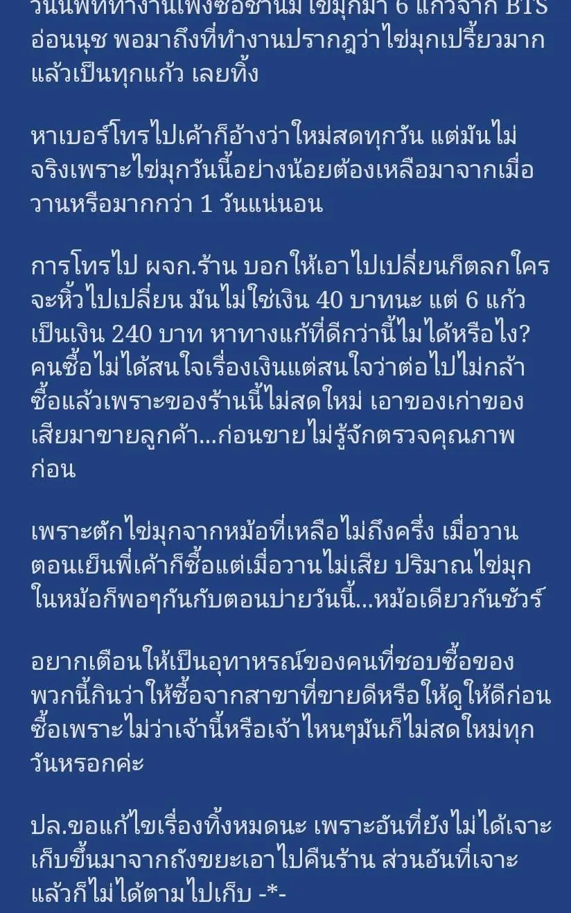 "พี่วันก่อนผมซื้อไก่ร้านพี่จำได้มั้ย ...ไก่พี่ไม่สุกนะครับ ผมบอกเผื่อลูกค้าคนอื่นเจอนะพี่"