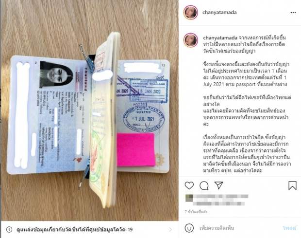 จากเหตุการณ์ที่เกิดขึ้นทำให้มีหลายคนเข้าใจผิดถึงเรื่องการฉีดวัคซีนไฟเซอร์ของชัญญ่า จึงขอชี้แจงตรงนี้ และยังคงยืนยันว่าชัญญ่าไม่ได้อยู่ประเทศไทยมาเป็นเวลา 1 เดือนค่ะ เดินทางออกจากประเทศตั้งแต่วันที่ 1 July 2021 ตาม passport ที่แนบด้านล่าง