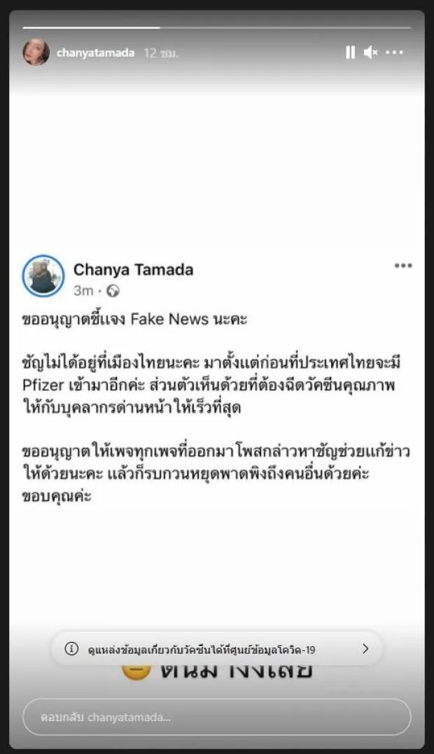 ขออนุญาตชี้เเจง Fake News นะคะ ชัญไม่ได้อยู่ที่เมืองไทยนะคะ มาตั้งเเต่ก่อนที่ประเทศไทยจะมี Pfizer เข้ามาอีกค่ะ ส่วนตัวเห็นด้วยที่ต้องฉีดวัคซีนคุณภาพให้กับบุคลากรด่านหน้าให้เร็วที่สุด