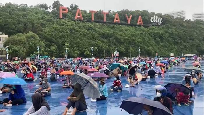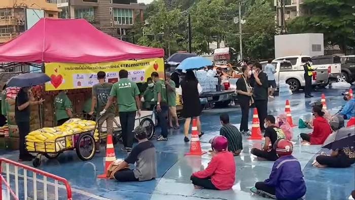 ประชาชนผู้ได้รับผลกระทบโควิด-19 ในเมืองพัทยานับพันคน ยอมรอรับแจกข้าวสารอาหารแห้งท่ามกลางสายฝนที่ตกลงมาอย่างต่อเนื่อง โดยมีเจ้าหน้าที่เทศกิจเมืองพัทยาและเจ้าหน้าที่ฝ่ายกิจการพิเศษเมืองพัทยาคอยดูแลจัดระเบียบตามมาตรการป้องกันโรคระบาด
