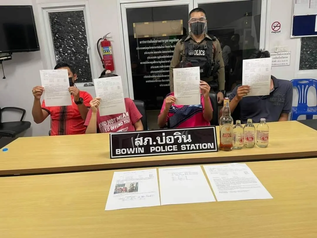 คืนวันศุกร์ ที่ 6 ส.ค. 64 สภ.บ่อวิน จับกุมข้อหา ร่วมกันทำกิจกรรม ( ดื่มสุรา ) อันเป็นการฝ่าฝืน พรก.ฉุกเฉิน 2548ฯและกระทำการใดๆ ที่ไม่ถูกสุขลักษณะ ตาม พ.ร.บ.โรคติดต่อฯ