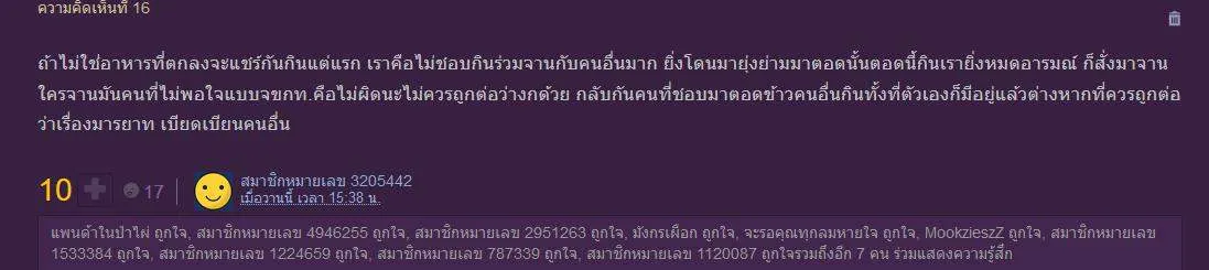 ถ้าไม่ใช่อาหารที่ตกลงจะแชร์กันกินแต่แรก เราคือไม่ชอบกินร่วมจานกับคนอื่นมาก ยิ่งโดนมายุ่งย่ามมาตอดนั้นตอดนี้กินเรายิ่งหมดอารมณ์ ก็สั่งมาจานใครจานมันคนที่ไม่พอใจแบบจขกท.คือไม่ผิดนะไม่ควรถูกต่อว่างกด้วย กลับกันคนที่ชอบมาตอดข้าวคนอื่นกินทั้งที่ตัวเองก็มีอยู่แล้วต่างหากที่ควรถูกต่อว่าเรื่องมารยาท เบียดเบียนคนอื่น
