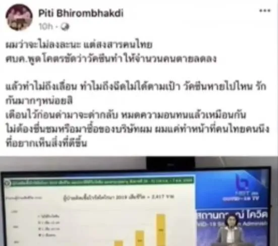 หนุ่มต๊อด ปิติ คงจะทนเห็นความเหลื่อมล้ำและความไม่เป็นธรรม ในการบริหารจัดการประเทศจัดการโควิชรวมไปถึงวัคซีนต่างๆจึงได้ออกมาโพสต์ ผ่าน Facebook ส่วนตัว ถึงเรื่องดังกล่าว แบบดุเดือดเลยล่ะ ซึ่งเราก็ไม่ค่อยจะเห็นหนุ่มต๊อดออกมาโพสต์อะไรแบบนี้ ทำเอาหลายคนตกอกตกใจ รวมไปถึงผู้สื่อข่าวก็ต้องแอบไปตามดูว่าเป็น Facebook ตัวจริงหรือเปล่าปรากฏว่าเป็นของจริงจ้า