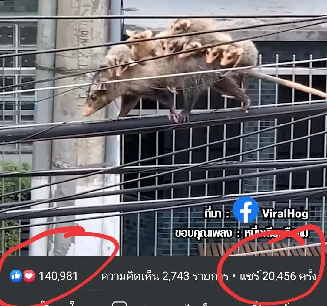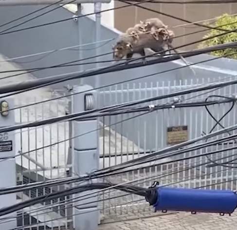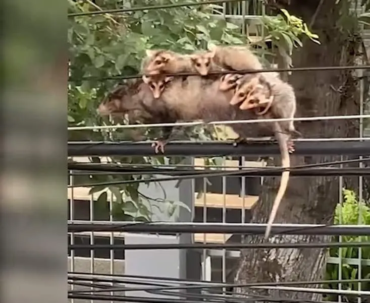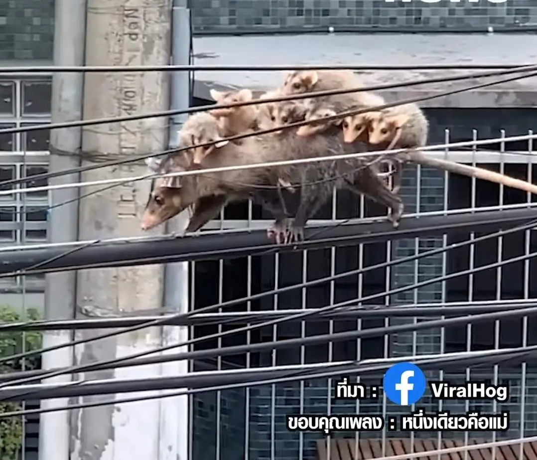 เป็นคลิปแม่โอพอสซัม แบกลูกน้อย 7 ตัว เดินไต่สายไฟเพื่อไปใหนสักแห่ง