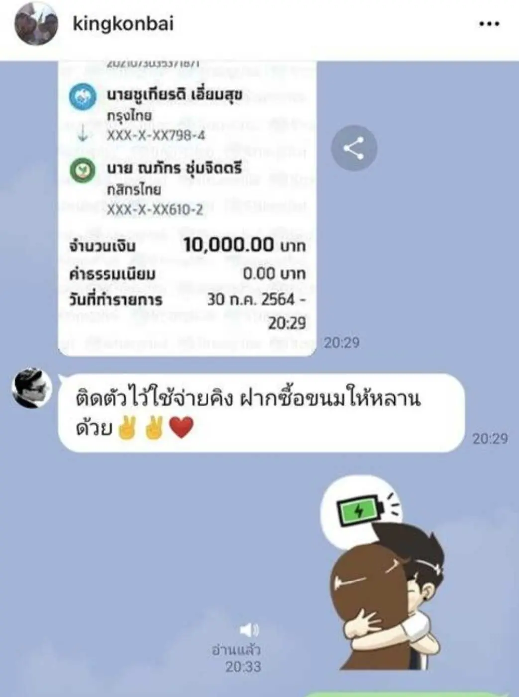 คิง ก่อนบ่าย เผยความลับที่หลายคนไม่รู้ว่าทุกวันนี้อยู่รอดมาได้ ส่วนหนึ่งเป็นเพราะอะไร โดยคิงได้โพสต์ภาพลงIG พร้อมข้อความแช็ตไลน์ที่ ชูเกียรติ เอี่ยมสุข หรือ นุ้ย เชิญยิ้ม ส่งสลิปการโอนเงินมาให้จำนวน 10,000 บาท เมื่อวันที่ 30 ก.ค.2564 พร้อมส่งข้อความตามมาว่า “ติดตัวไว้ใช้จ่ายคิง ฝากซื้อขนมให้หลานด้วย”