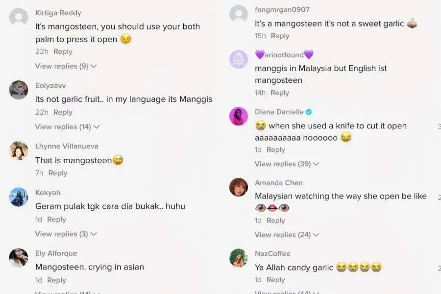 เมื่อเร็ว ๆ นี้ TikToker หญิงชาวตะวันตกได้อัปโหลดวิดีโอเกี่ยวกับการหาผลไม้รสหวาน แต่ข้างในมีรูปร่างคล้ายกับกระเทียม ผลไม้นี้ไม่ใช่อะไรเลย นอกจากมันคือมังคุด และในวิดีโอ เธอเรียกมันว่า 'กระเทียมหวาน' หรือ 'ผลไม้กระเทียมหวาน' อย่างมีความสุข
