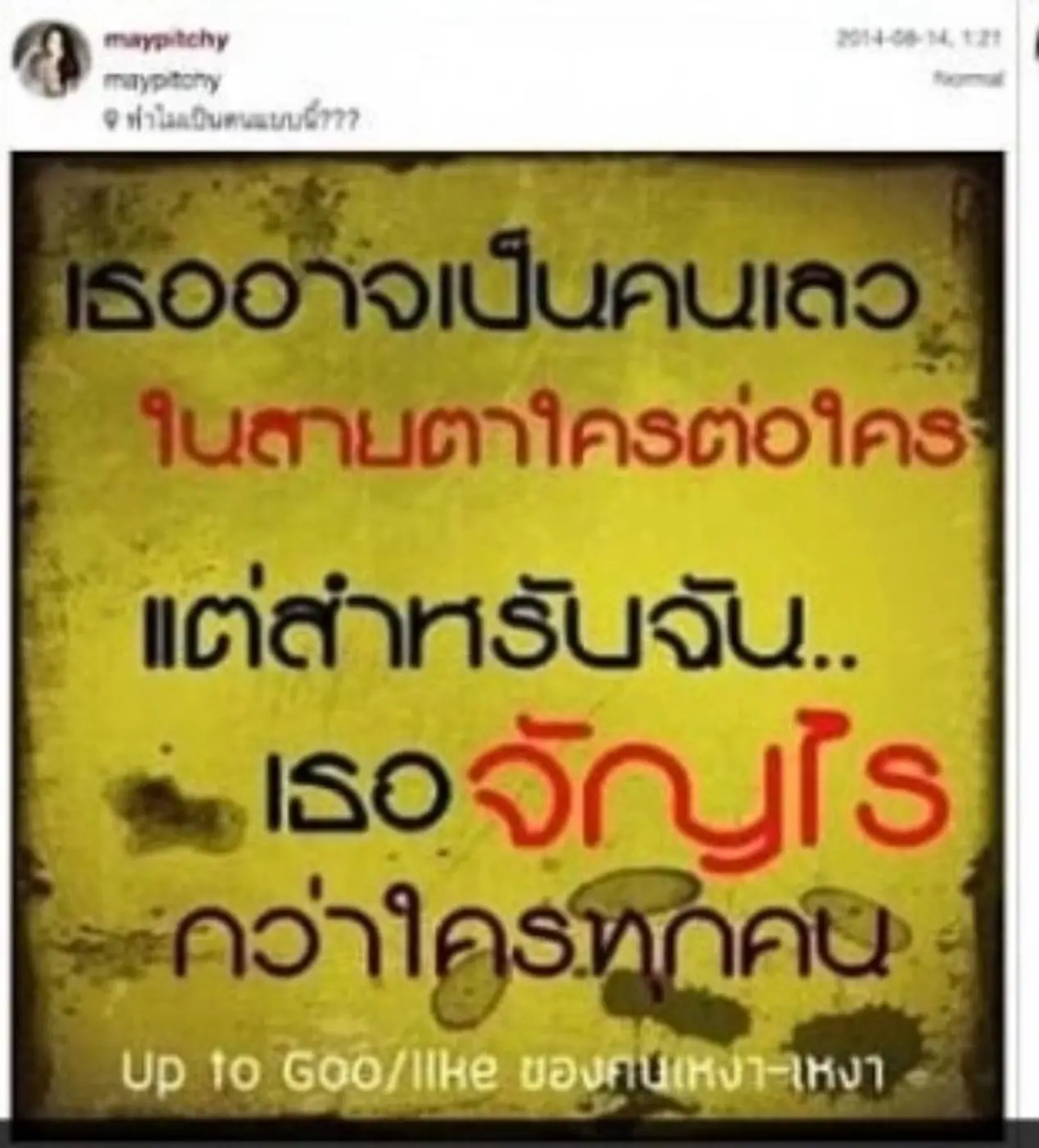 แต่ดรามาไม่ยอมจบ เมื่อต่อมาฝ่ายหญิงให้ข่าวกับสื่อมวลชนว่าถูกคนสะกดรอยตาม ทำให้เธอเริ่มรู้สึกถึงการถูกคุกคาม ซึ่งอาจจะมีผลต่อความปลอดภัย ซึ่งเมื่อประมวลเหตุการณ์ต่างๆ เรื่องทั้งหมดเกิดขึ้นหลังจากที่เธอโพสต์ในไอจี ข้อความที่อ่านแล้วชวนสะดุ้งว่า “เธออาจเป็นคนเลวในสายตาใครต่อใคร แต่สำหรับฉัน เธอจังไรกว่าใครทุกคน”
