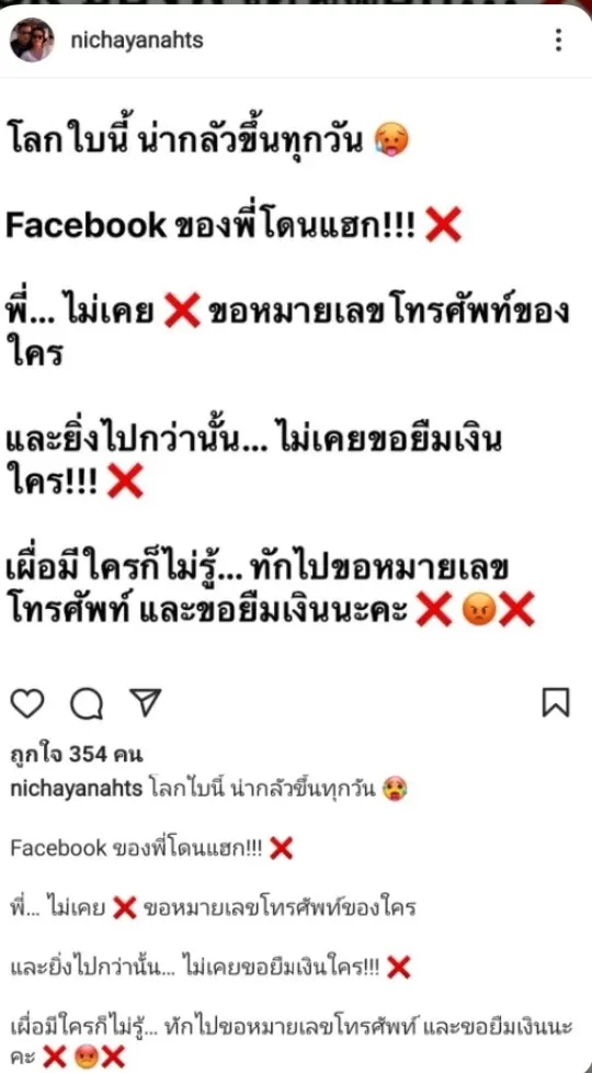โพสต์ระบุ "โลกใบนี้ น่ากลัวขึ้นทุกวัน 🥵 Facebook ของพี่โดนแฮก!!! ❌ พี่… ไม่เคย ❌ ขอหมายเลขโทรศัพท์ของใคร และยิ่งไปกว่านั้น… ไม่เคยขอยืมเงินใคร!!! ❌ เผื่อมีใครก็ไม่รู้… ทักไปขอหมายเลขโทรศัพท์ และขอยืมเงินนะคะ ❌ 😡❌"