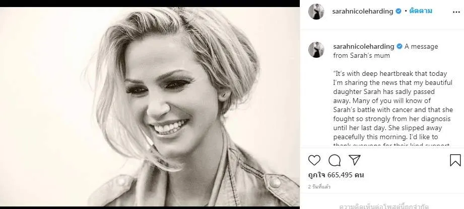 นักร้องชายอังกฤษ "ซาราห์ ฮาร์ดิง" เธอเป็นอดีตสมาชิกวง Girls Aloud ได้เสียชีวิตด้วยวัยเพียง 39 ปีเท่านั้น หลังจากต่อสู้กัยโรคมะเร็งเต้านม... และ แม่ของเธอก็ยืนยันข่าวการเสียชีวิต ผ่านโพสต์ในบัญชี IG ของลุกสาว เมื่อวันอาทิตย์ที่ผ่านมา