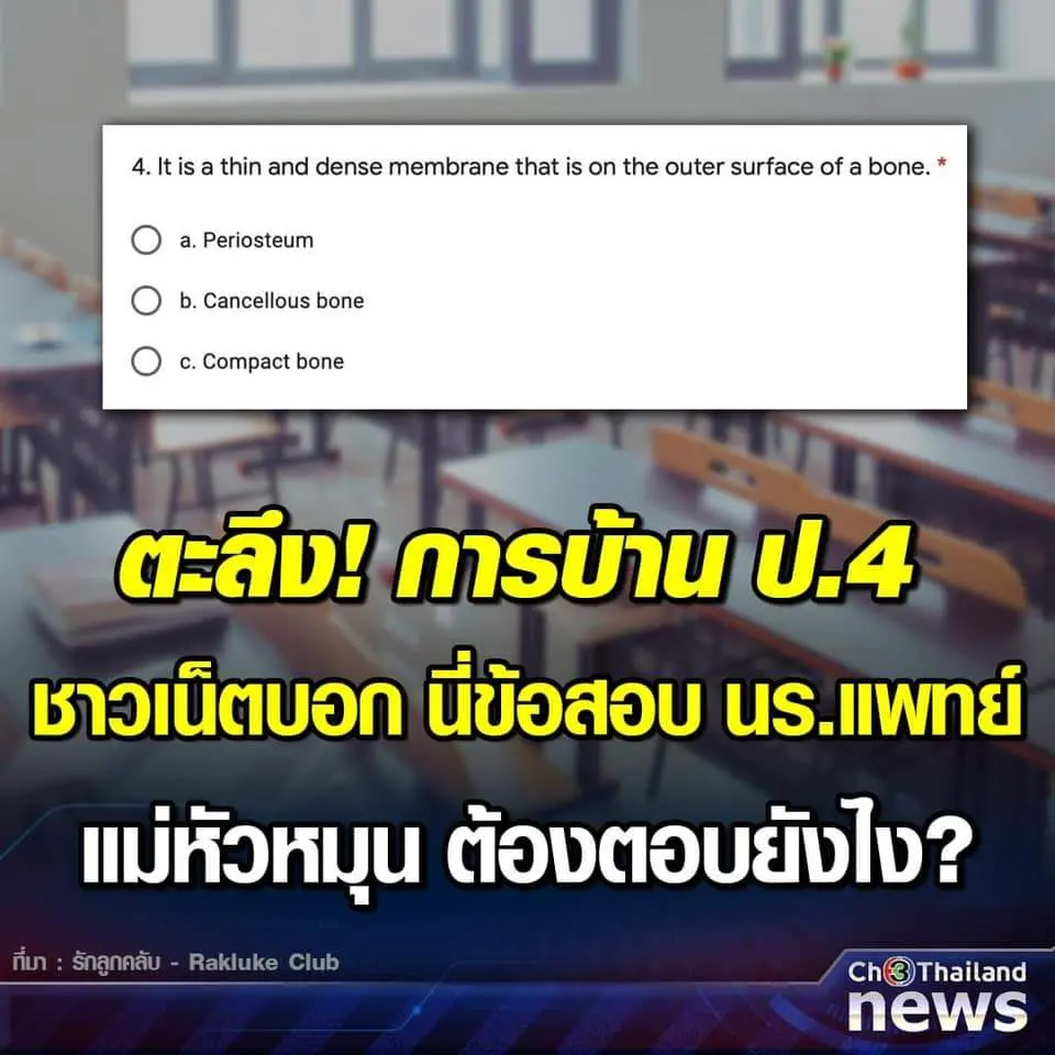 ทำเอาผู้ปกครองถึงกับมึน หลังเพจรักลูกคลับ เปิดเผยการบ้านนักเรียนชั้น ป.4 รายหนึ่ง ที่มีคำถามว่า It is a thin and dense membrane that is on the outer surface of a bone (ส่วนประกอบใดที่เป็นแผ่นบางอยู่นอกกระดูกกระโหลกศีรษะ) โดยมีคำตอบให้เลือก 3 ข้อ คือ